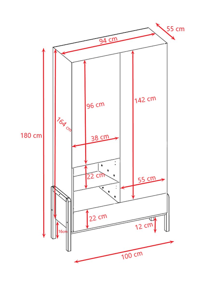 Das Innere des Schrankes besteht aus einem geräumigen Fach mit Kleiderstange und fünf Einlegeböden, von denen zwei offen sind und so bequemen Zugriff bieten. An der Unterseite des Schrankes befindet sich eine praktische, abschließbare Schublade.