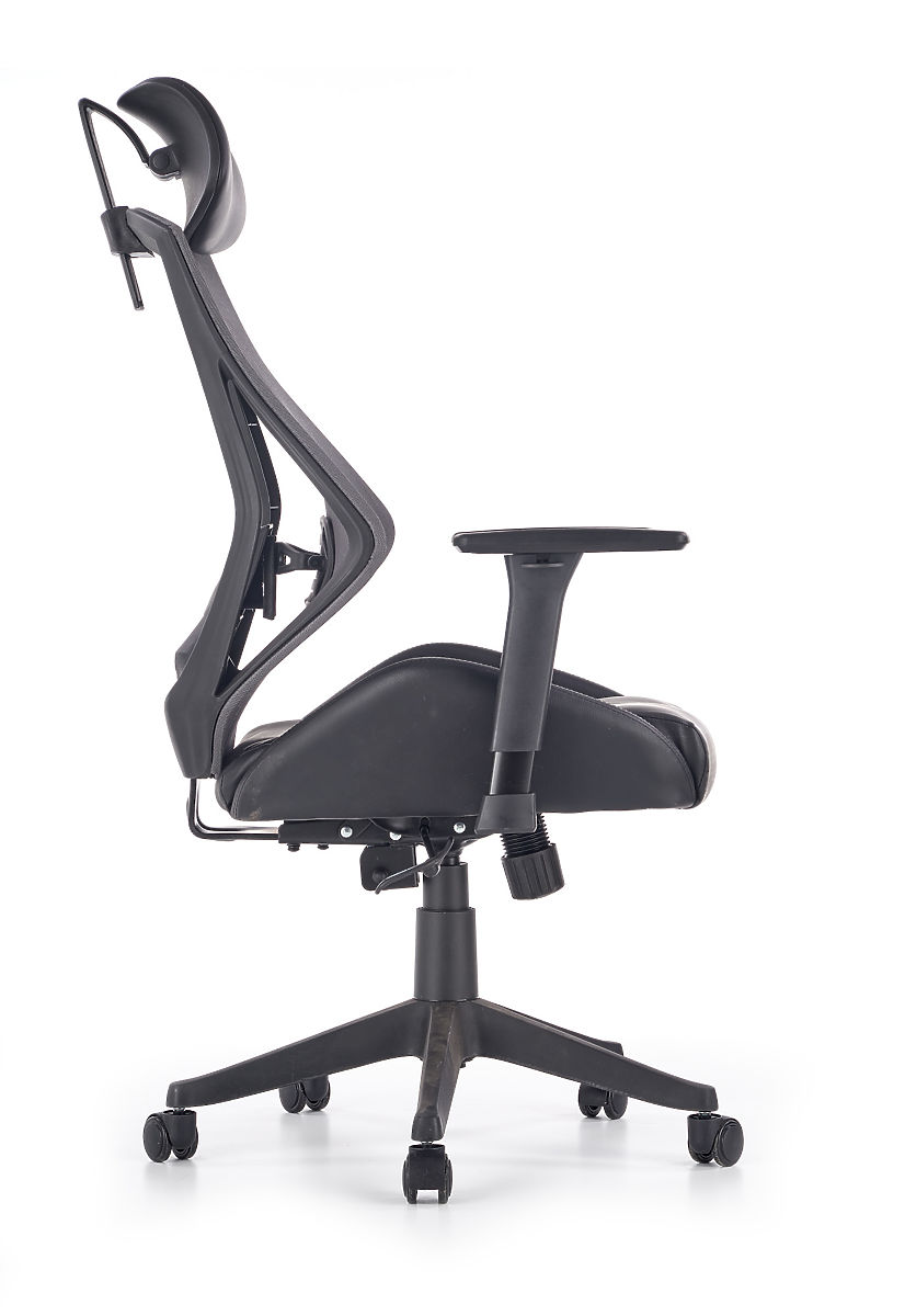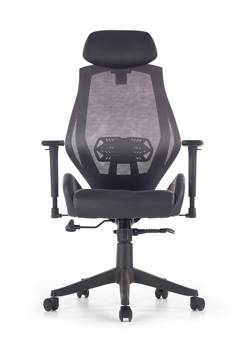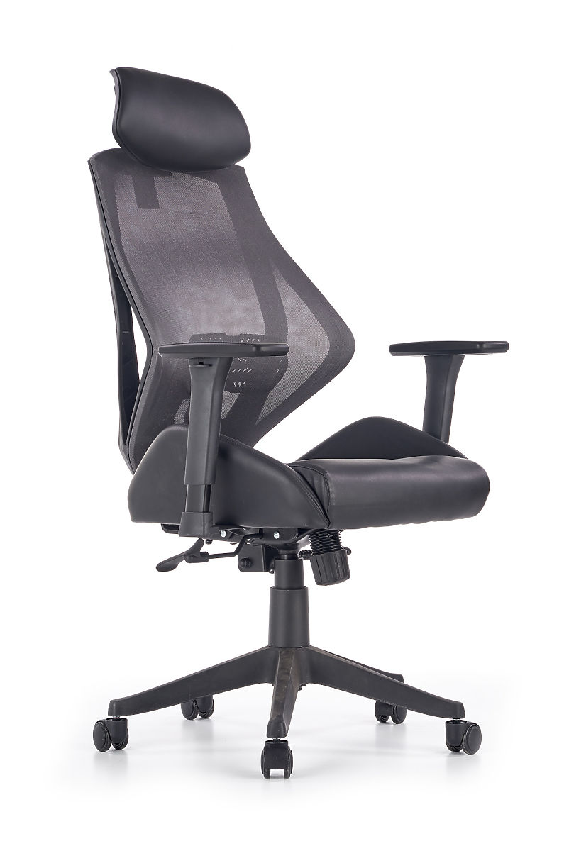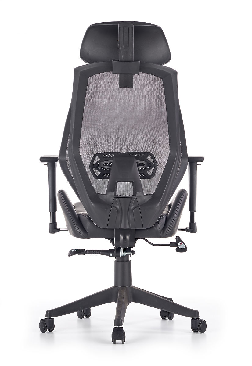 Der Multiblock-Mechanismus bietet die Möglichkeit zum Schaukeln, dessen Härte Sie selbst regulieren können. Die ergonomisch geformte Rückenlehne und die Kopfstütze sind mit atmungsaktivem Netzstoff bezogen, der Sitz des Stuhls ist mit schwarzem Kunstleder gepolstert. Die Rückenlehne ist zusätzlich mit einer Lendenstütze ausgestattet, die zusammen mit den verstellbaren Armlehnen gesundes Sitzen gewährleistet. Die Konstruktion besteht aus robustem Kunststoff.