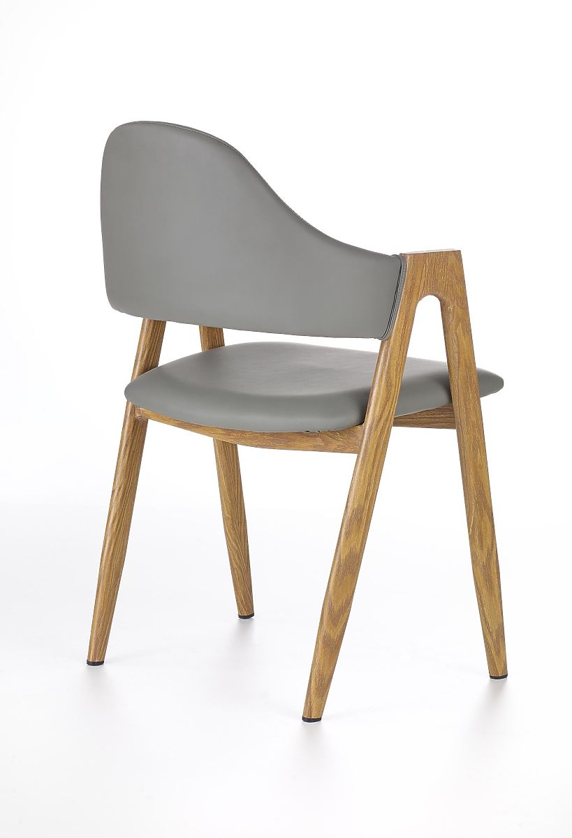 Der Stuhl ist mit grauem Kunstleder bezogen. Das Gestell besteht aus lackiertem Stahl in der Farbe Honigeiche.