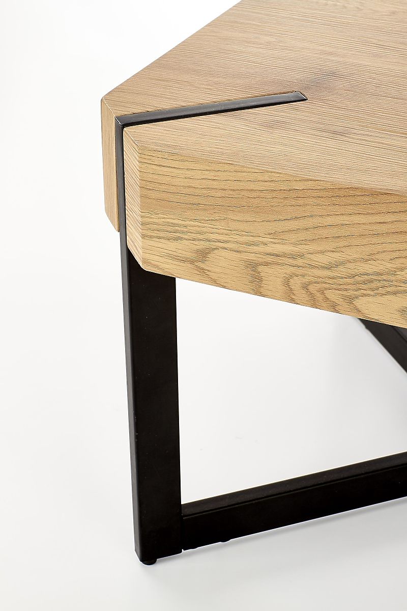 Die Tischplatte besteht aus laminiertem MDF in der Farbe Goldene Eiche. Das Gestell ist aus schwarz pulverbeschichtetem Stahl gefertigt.