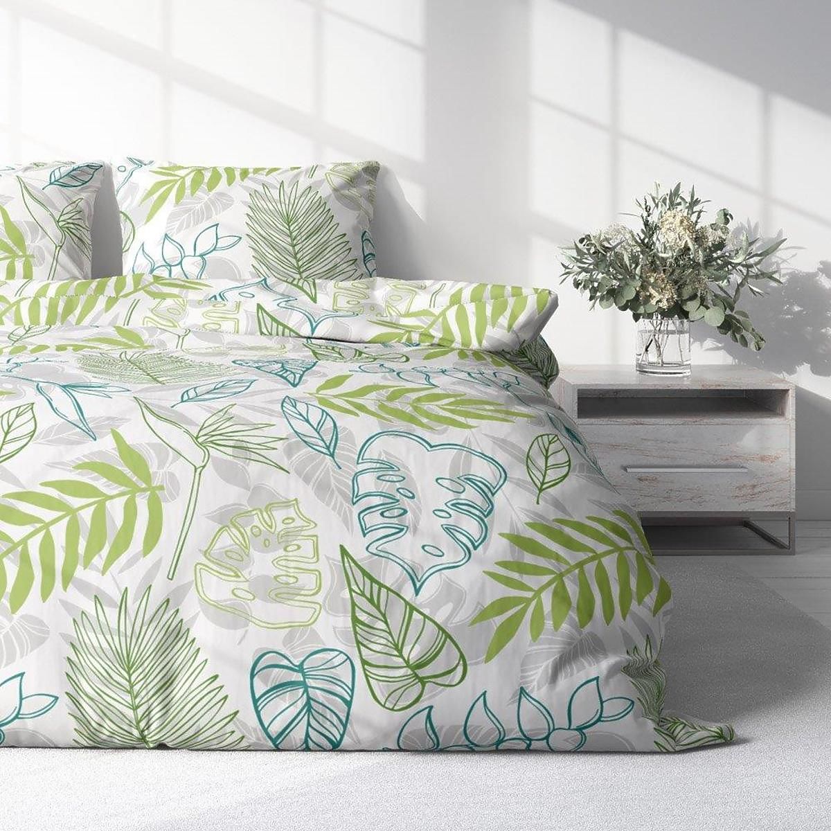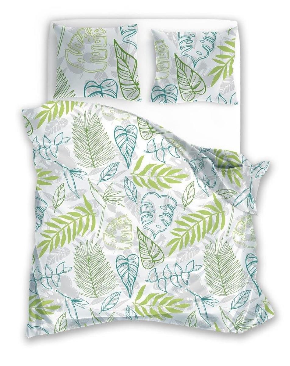 Dieses wunderschöne Bettlaken mit dem Motiv großer Pflanzenblätter bringt einen frischen Hauch von Natur in Ihr Schlafzimmer. Dank der weichen Mikrofaser, aus der die Bettwäsche besteht, wird der Schlaf bequem und angenehm wie nie zuvor. Die Farben der Bettwäsche behalten auch nach mehreren Wäschen ihre Sättigung und Intensität. Der praktische Reißverschluss erleichtert garantiert das Beziehen von Kissen und Bettdecken.