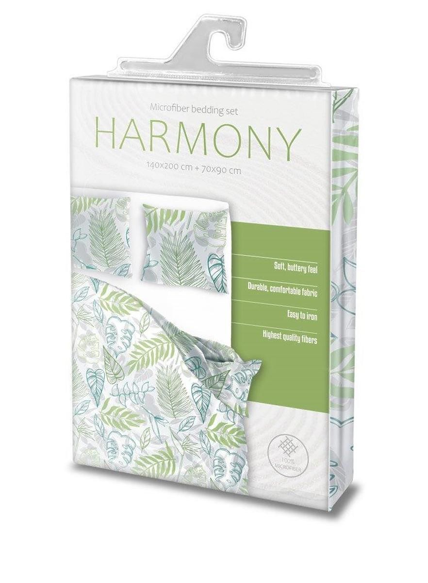 Die Bettwäsche umfasst einen Bettbezug 140 x 200 cm und einen Kissenbezug 70 x 90 cm . Die Einbände haben auf beiden Seiten das gleiche Motiv aus großen Blättern verschiedener Pflanzenarten in mehreren Grüntönen. Unter den grünen Blättern verbergen sich noch unscheinbare graue Blätter und das alles liegt auf einem weißen Hintergrund.