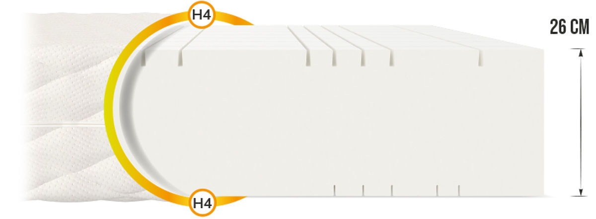 Der Schaum hat eine ungleichmäßige Zellstruktur, wodurch er eine bessere Körperunterstützung, Komfort und Flexibilität erreicht. Die Matratze passt sich perfekt der Körperform an und bleibt dabei sehr leicht. Das Material ist äußerst langlebig und verformungsbeständig. Die poröse Struktur ermöglicht eine perfekte Luftzirkulation , wodurch die Bildung von Pilzen und Schimmel verhindert wird. Die konturgeschnittene Ebene in Form eines Gitters zeichnet sich durch orthopädische Eigenschaften aus.