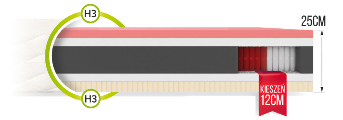 Die COMFORT- Matratze mit einer Höhe von 25 cm ist ein Produkt für die anspruchsvollsten Kunden. Die Basis dieses komfortablen Modells mit vielen Lagen ist ein Multi-Pocket-Einsatz, der über eine erhöhte Anzahl an Taschen mit Federn verfügt. Es gibt viel mehr Mehrfachtaschenfedern als normale Taschenfedern. Die Federn unterteilen die Matratze in 7 Zonen , die jeweils ausreichend Unterstützung für ein bestimmtes Körperteil bieten. Dank dieser Lösung biegen sich die einzelnen Federn individuell und passen sich der Körperform der liegenden Person an. Auch für Paare empfiehlt sich die Matratze, da sie die durch die Bewegungen des Gegenübers entstehenden Beschwerden reduziert und so für einen ungestörten Tiefschlaf sorgt.
