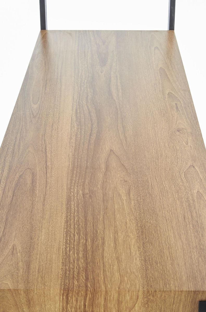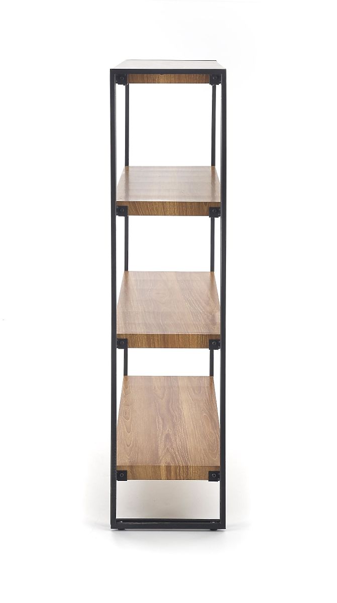 Das Regal besteht aus laminierter MDF-Platte im goldenen Eichendekor, was für ein elegantes Erscheinungsbild sorgt. Seine schwarze stabile Struktur aus pulverbeschichtetem Stahl verleiht dem Regal ein modernes und stilvolles Design.