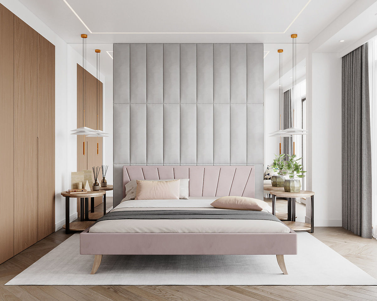 Gepolstertes Bett HEAVEN in sanftem Puderrosa mit dekorativer Steppung. .. mehr