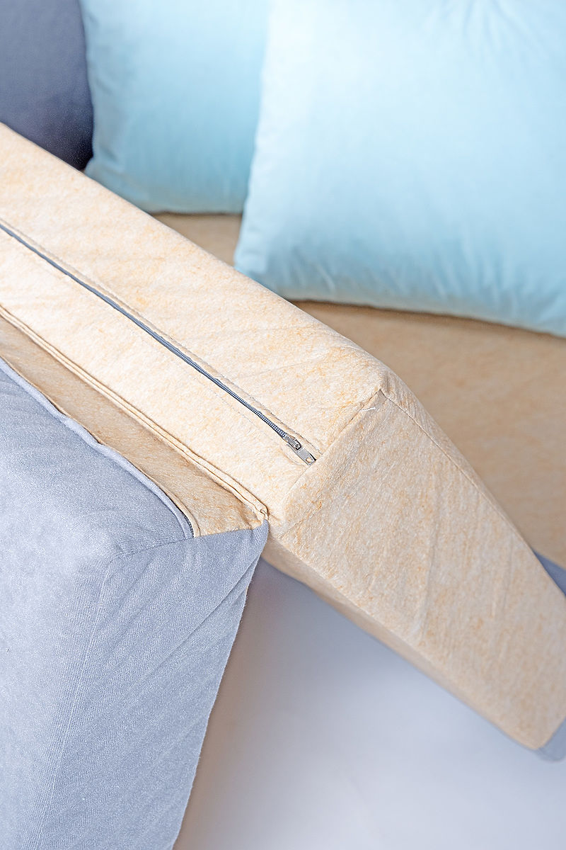 Dunkelgraues Sofa Jack mit hellblauen Kissen für Jungenzimmer. .. mehr