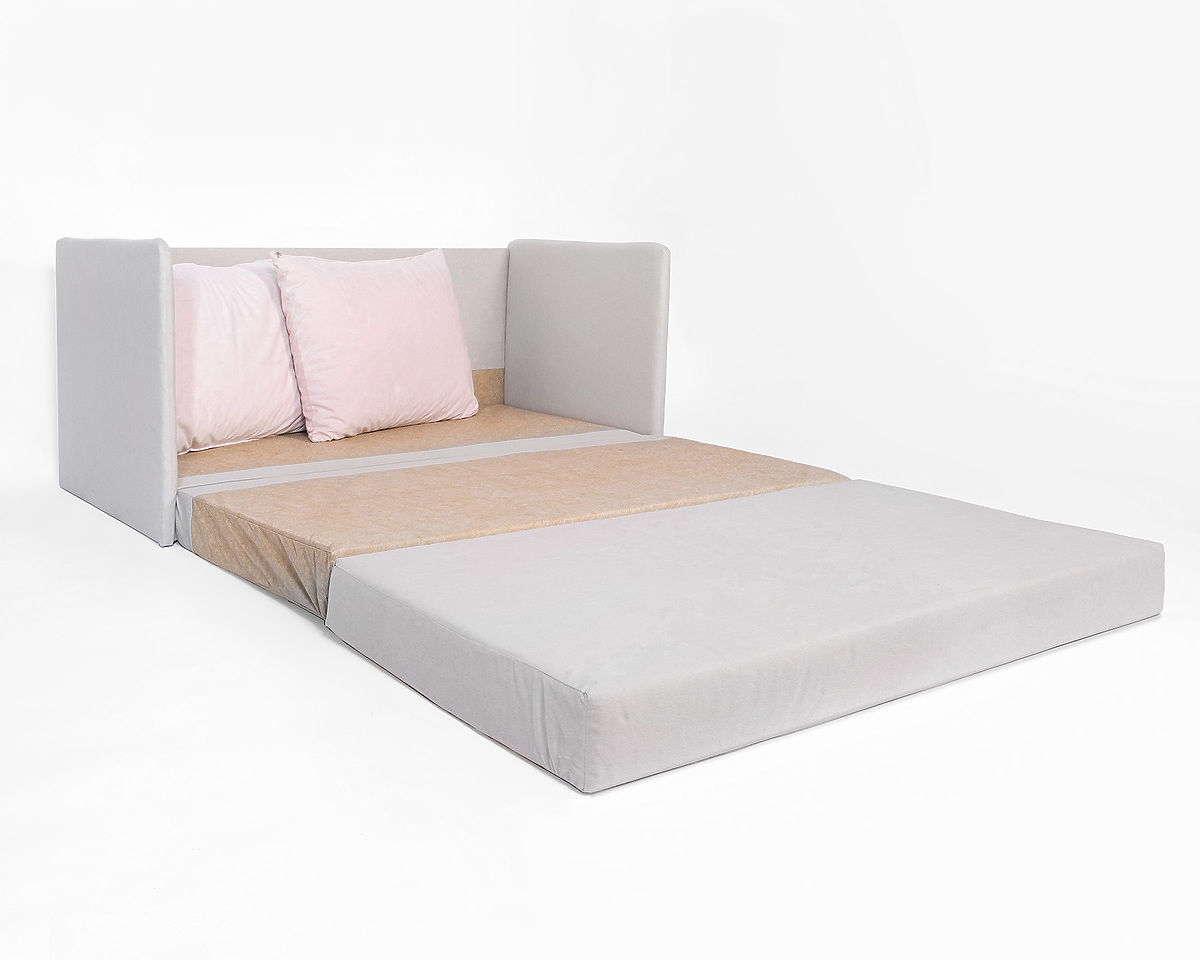 Das wunderschöne und sehr praktische hellgraue Sofa Jack mit puderrosa Kissen passt in jedes Mädchenzimmer.