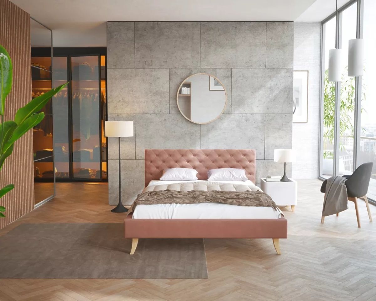 Das Bezugsmaterial des Polsterbettes ist der altrosa Veloursstoff Trinity. Er zeichnet sich durch eine feine Struktur und gleichzeitig hohe Widerstandsfähigkeit auch gegen Sonnenlicht aus. Er ist weich, flauschig und angenehm zu berühren. Zudem ist er sehr abriebfest und pillingresistent. Sie werden von seinem modernen Aussehen und der dekorativen Steppung am Kopfteil des Bettes begeistert sein.