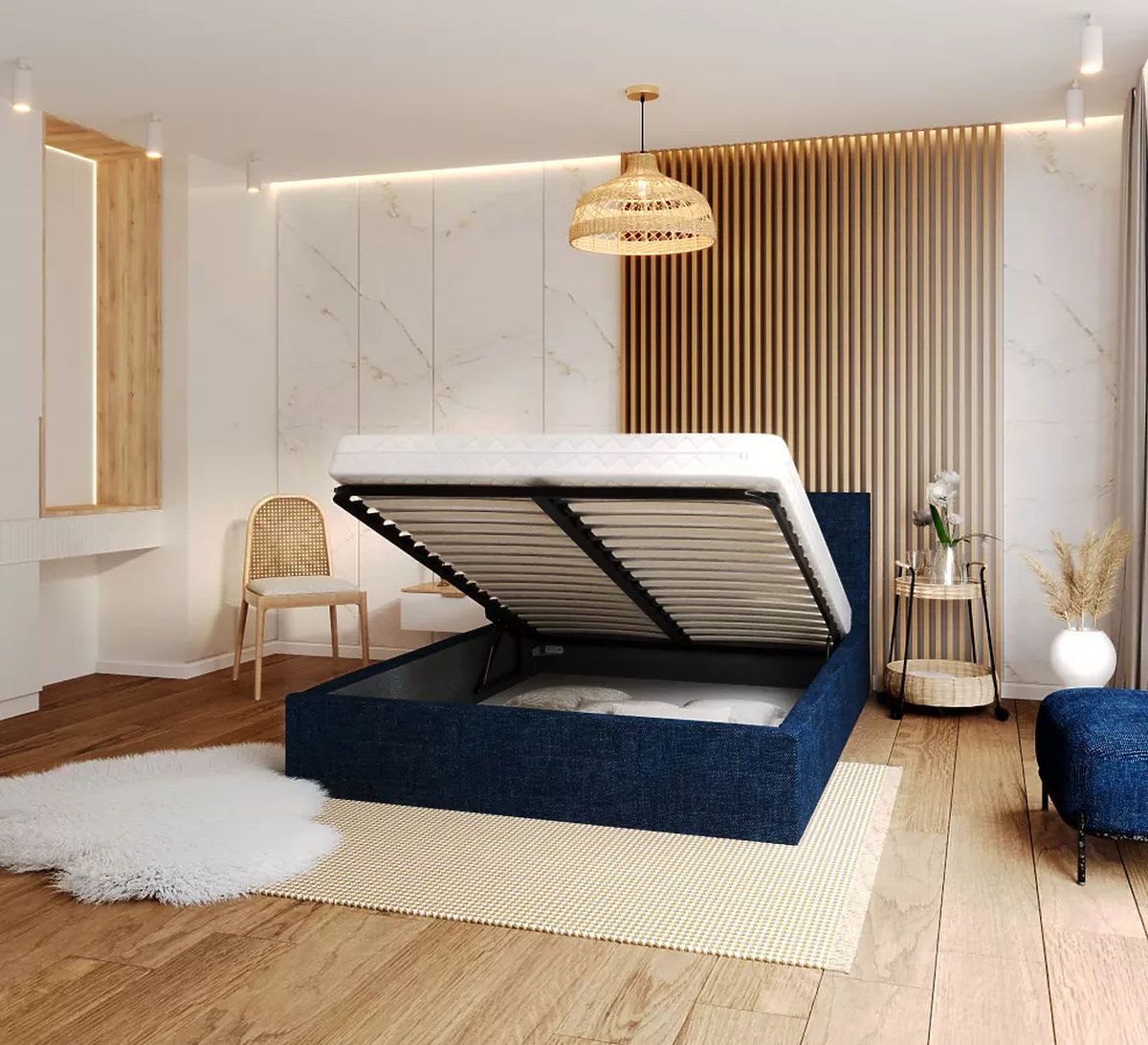 Das TULSA-Bett ist mit einem Hubgitter und Hubkolben ausgestattet , die es ermöglichen, nützlichen Stauraum unter dem Bett zu schaffen. Diese Art von Stauraum ist äußerst praktisch, insbesondere in Schlafzimmern, in denen es auf eine größere Platzersparnis ankommt. Die hochwertige Möbelplatte, aus der das Bett besteht, erhöht die Festigkeit des Bettes und ermöglicht es ihm, verschiedenen Belastungen und Drücken standzuhalten.