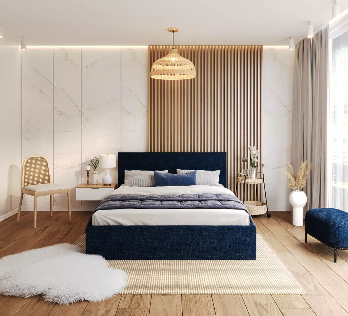 Das elegante Polsterbett TULSA in Dunkelblau mit den Maßen 120 x 200 cm ist ein wunderschönes Möbelstück, das nicht nur Schlafkomfort bietet, sondern durch sein zeitloses Design und die ansprechende Verarbeitung auch Flair ins Schlafzimmer bringt. Dunkelblau ist eine Farbe, die mit Ruhe, Selbstvertrauen und Eleganz assoziiert wird. Diese Farbe kann eine beruhigende Atmosphäre schaffen und dem Schlafzimmer ein Gefühl des Wohlbefindens verleihen. Das gepolsterte Kopfteil verleiht dem Raum Weichheit und Eleganz, während die Größe ausreichend Platz für zwei Personen zum bequemen Schlafen bietet.