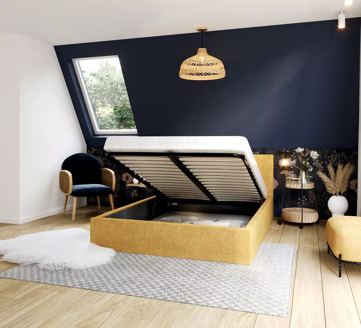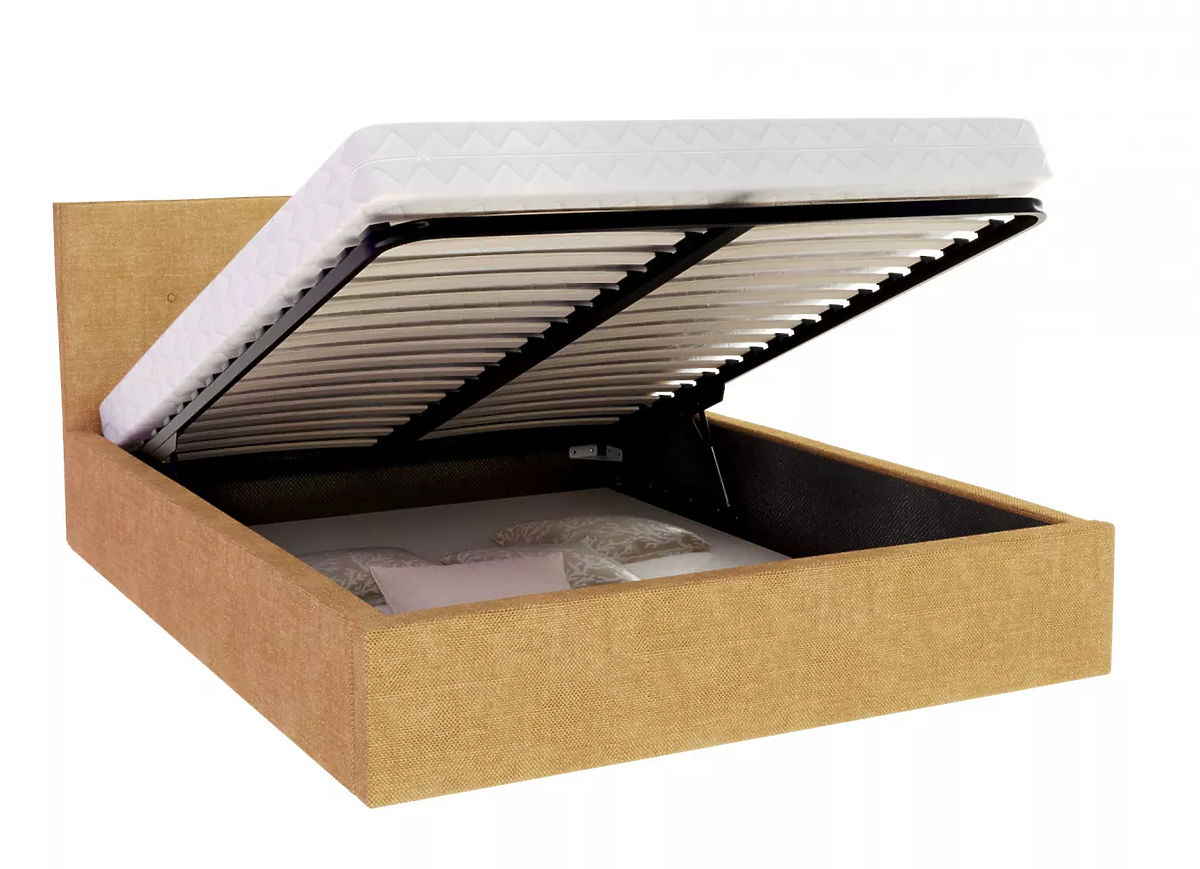 Das TULSA-Bett ist mit tollen Funktionen ausgestattet, die Praktikabilität und Langlebigkeit vereinen. Die Kombination aus Hubgitter und Hubkolben ermöglicht die Schaffung nützlichen Stauraums unter dem Bett, was in Schlafzimmern, in denen viel Stauraum benötigt wird, sehr praktisch ist. Gleichzeitig erhöht die hochwertige Möbelplatte, aus der das Bett gefertigt ist, seine Festigkeit und Widerstandsfähigkeit gegenüber Belastung und Druck. Dadurch bietet das Bett nicht nur praktischen Stauraum, sondern ist auch stabil und stabil .