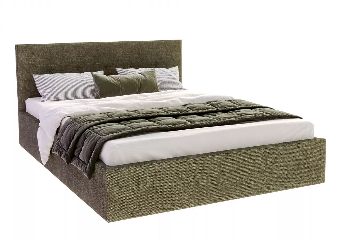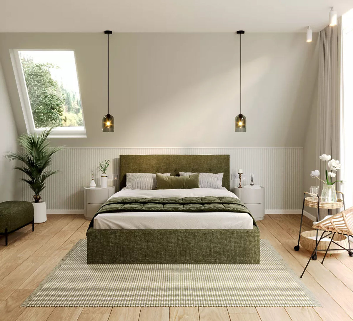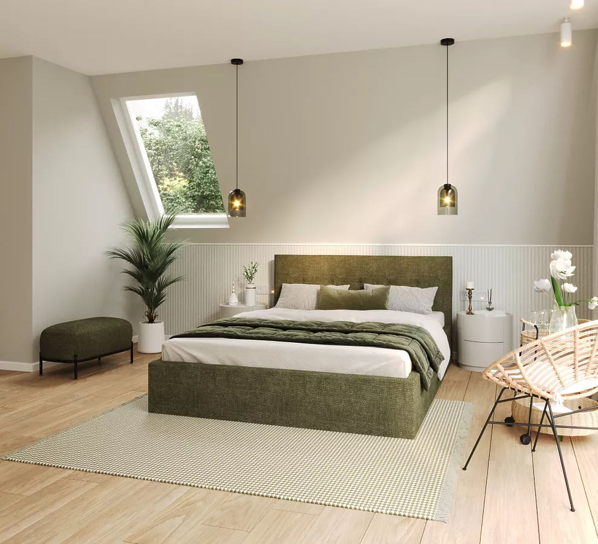 Polsterbett TULSA in der Größe 140 x 200 cm und der Farbe Olivgrün. Dieses Bett vereint schönes Design mit Komfort und Zweckmäßigkeit. Das gepolsterte Kopfteil verleiht dem Raum Weichheit und Eleganz und sorgt für ein harmonisches und angenehmes Erscheinungsbild. Dank der idealen Größe von 140 x 200 cm bietet das Bett ausreichend Platz, damit zwei Personen bequem schlafen können. Die Farbe Olivgrün wird oft mit Ruhe, Stabilität und Natur assoziiert und ist daher eine beliebte Wahl für Innenräume, insbesondere wenn Sie dem Raum eine angenehme und beruhigende Atmosphäre verleihen möchten.