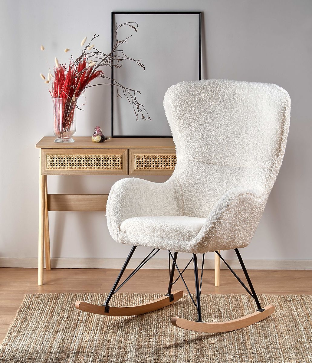 Dieser stilvolle Schaukelstuhl im cremefarbenen Design passt perfekt in jedes Interieur.