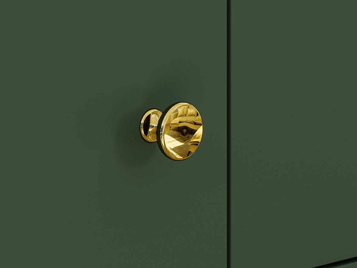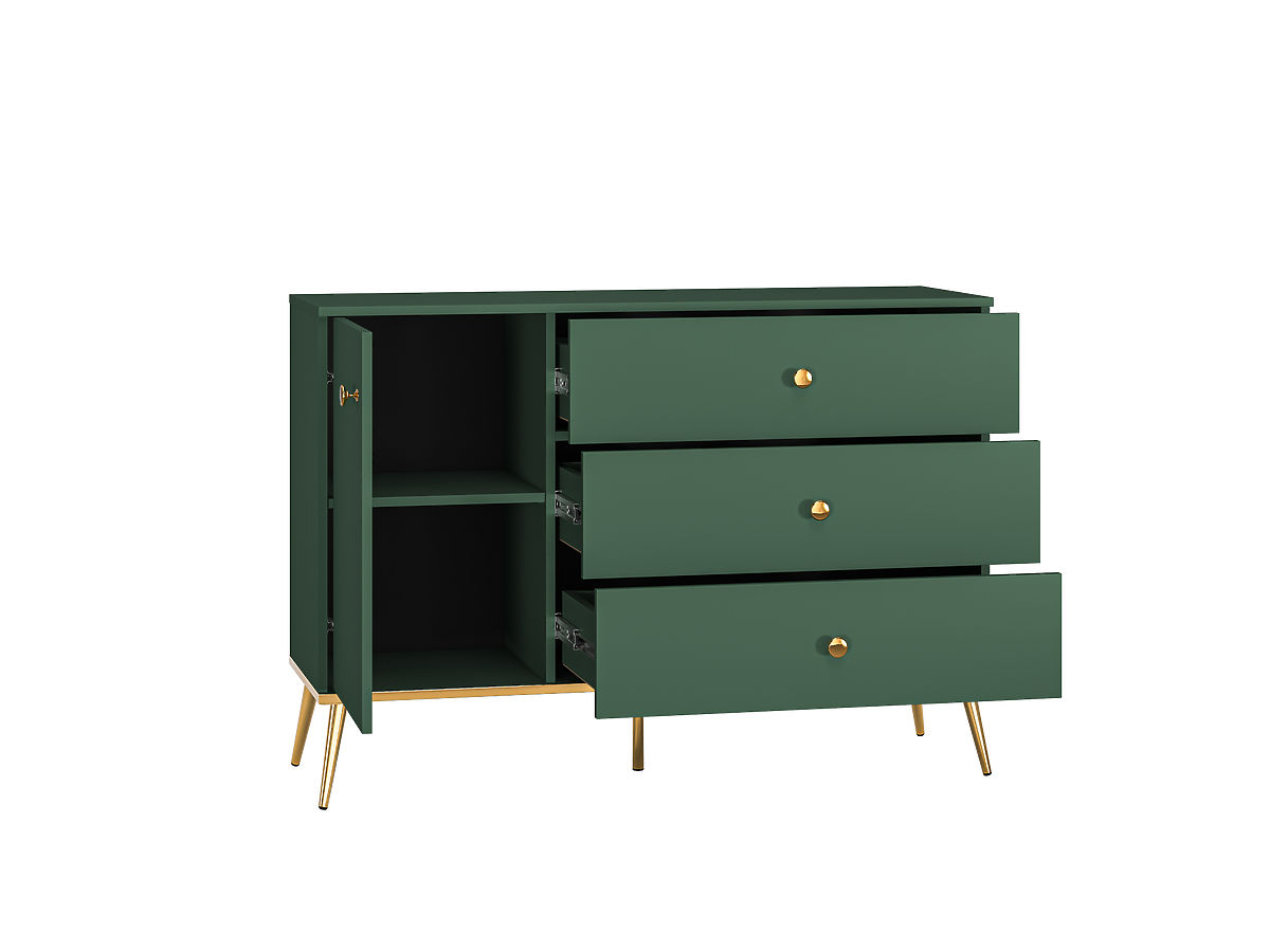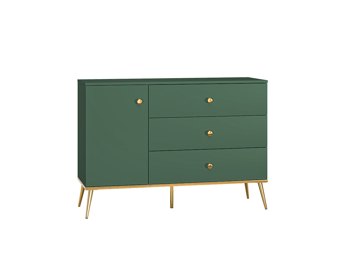 Bereichern Sie Ihr Interieur mit einem einzigartigen Möbelstück in Form einer kleineren Forest-Kommode , die einen schlichten, minimalistischen Eindruck macht, aber gleichzeitig mit ihrer atypischen Farbkombination aus Dunkelgrün und Gold für Eleganz sorgt. Frieden und Harmonie in Ihr Zuhause. Es passt perfekt in ein modernes Interieur sowie zum Wohnen im Retro-Stil.