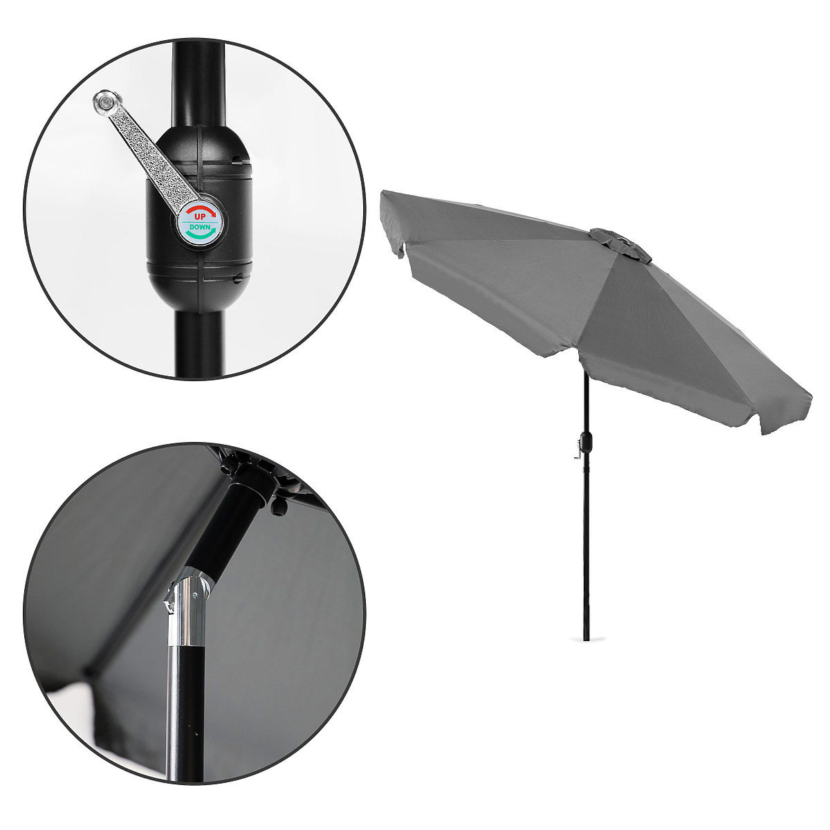 Neben der Funktionalität hat der Sonnenschirm ein einfaches, modernes Aussehen, was ihn zu einem großartigen Accessoire für Terrassen und Balkone, aber auch für Camping macht. Der Durchmesser des Sonnenschirms ermöglicht seine Installation auf den meisten Gartentischen.