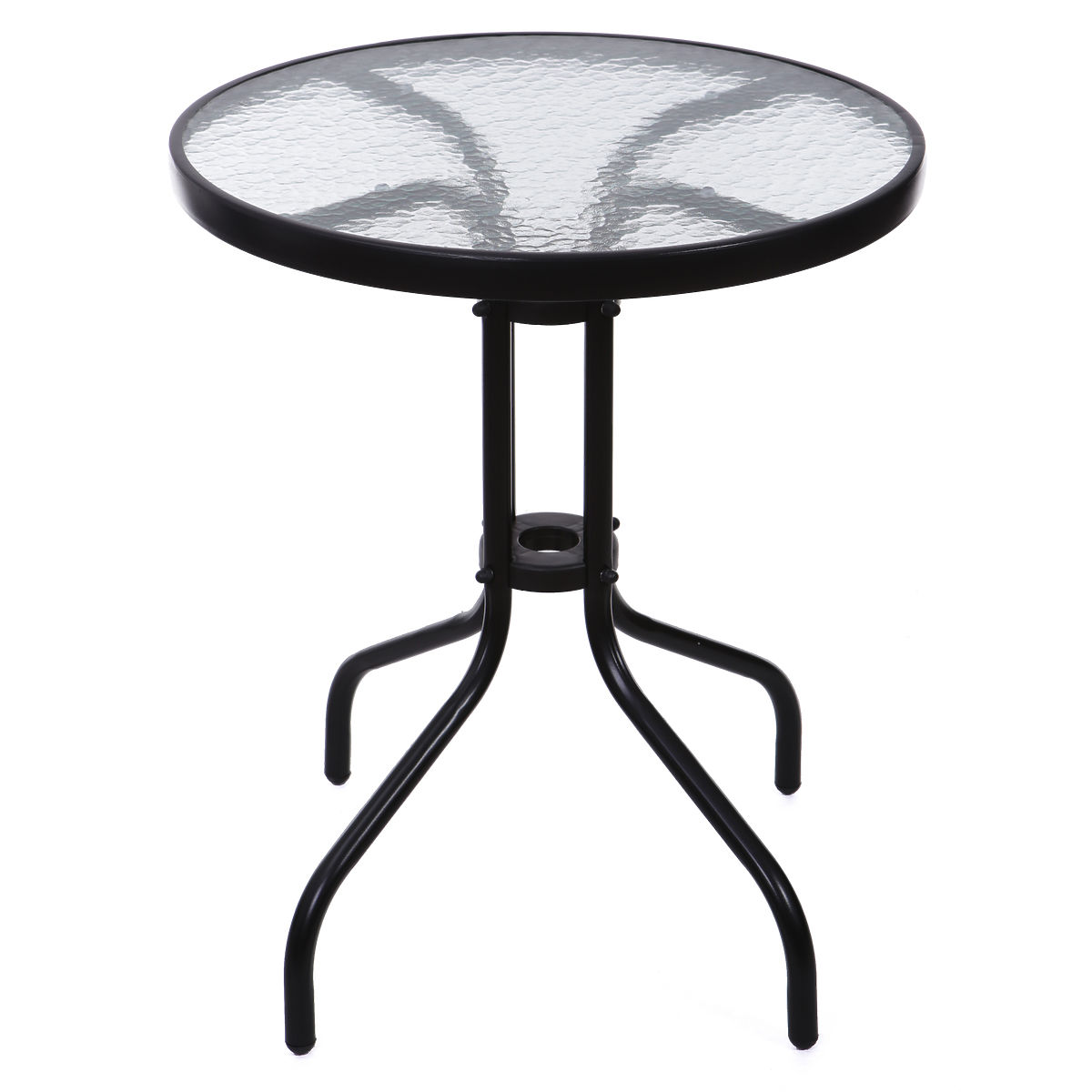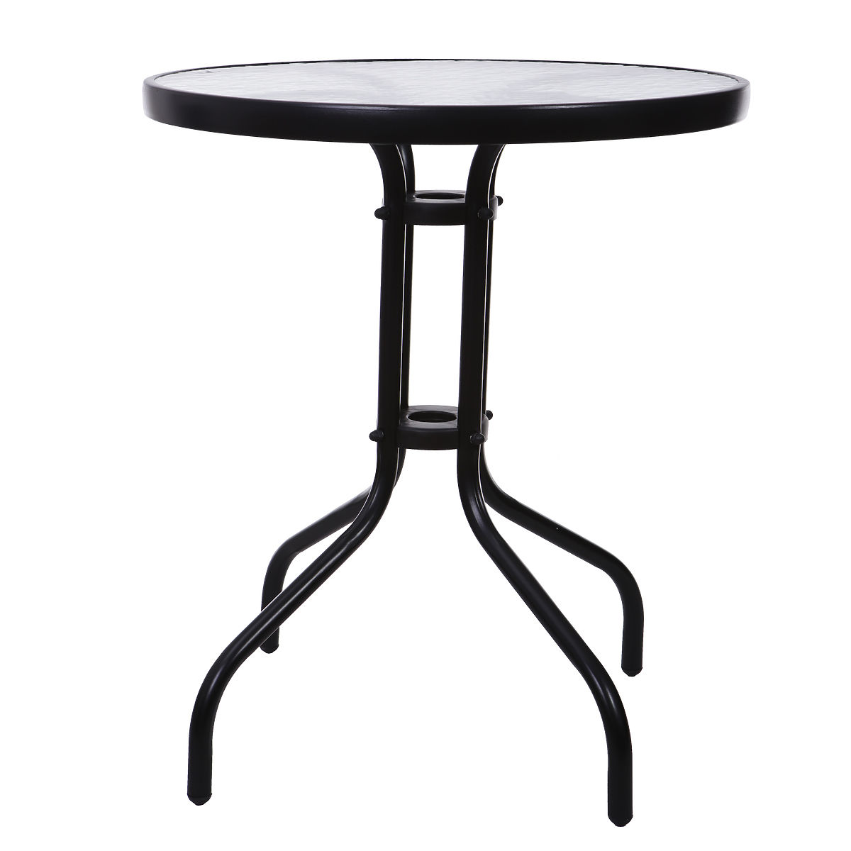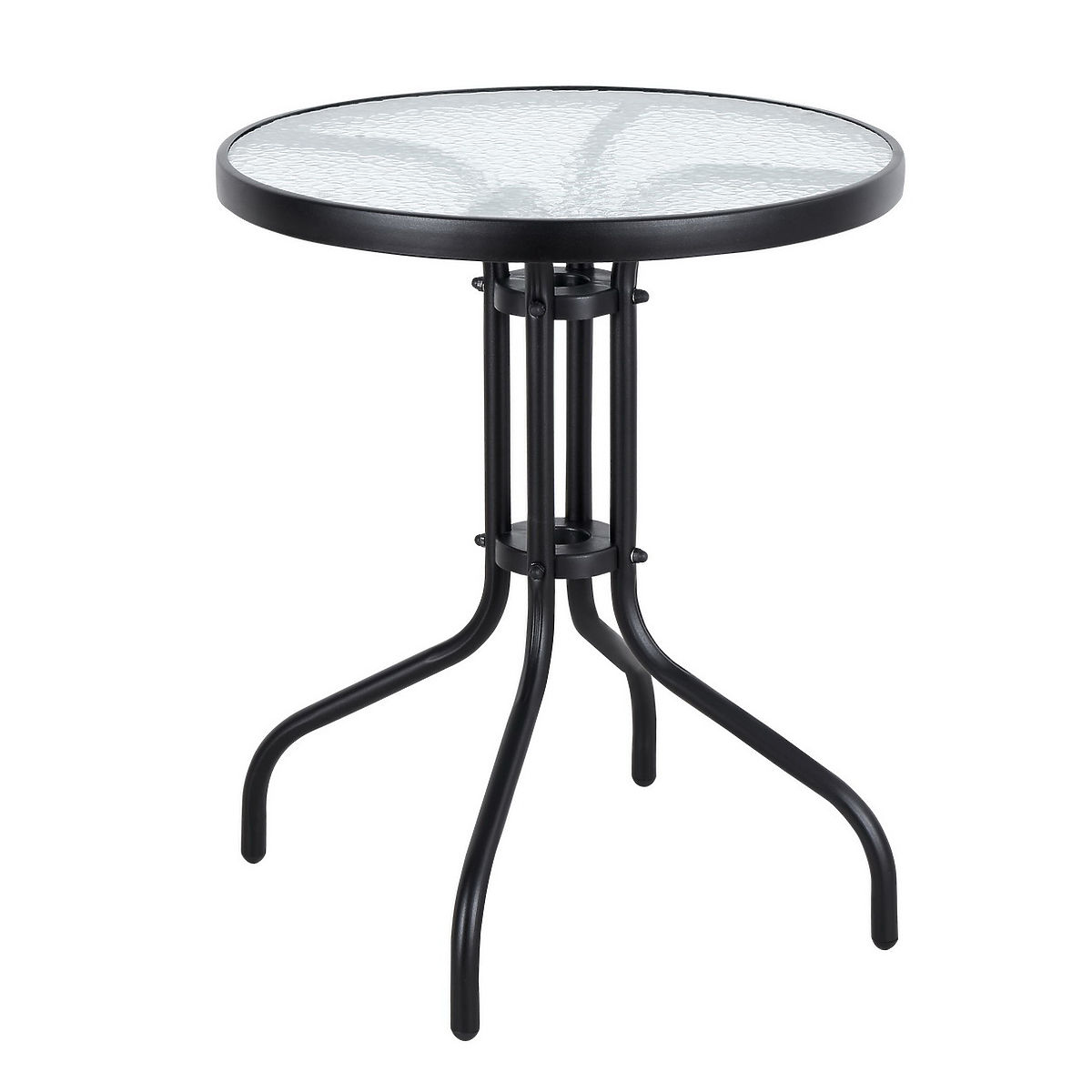 GUT ENTWORFENER GARTENTISCHDer Tisch bietet Platz für 4 Personen dank der großen Platte mit einem Durchmesser von 60 cm, die aus gehärtetem Glas besteht. Dieses Material ist kratzfest, schmutzabweisend und schwer zu beschädigen. An den Rändern des Tisches ist ein schwarzer Rahmen sichtbar, der einen modernen Charakter verleiht.