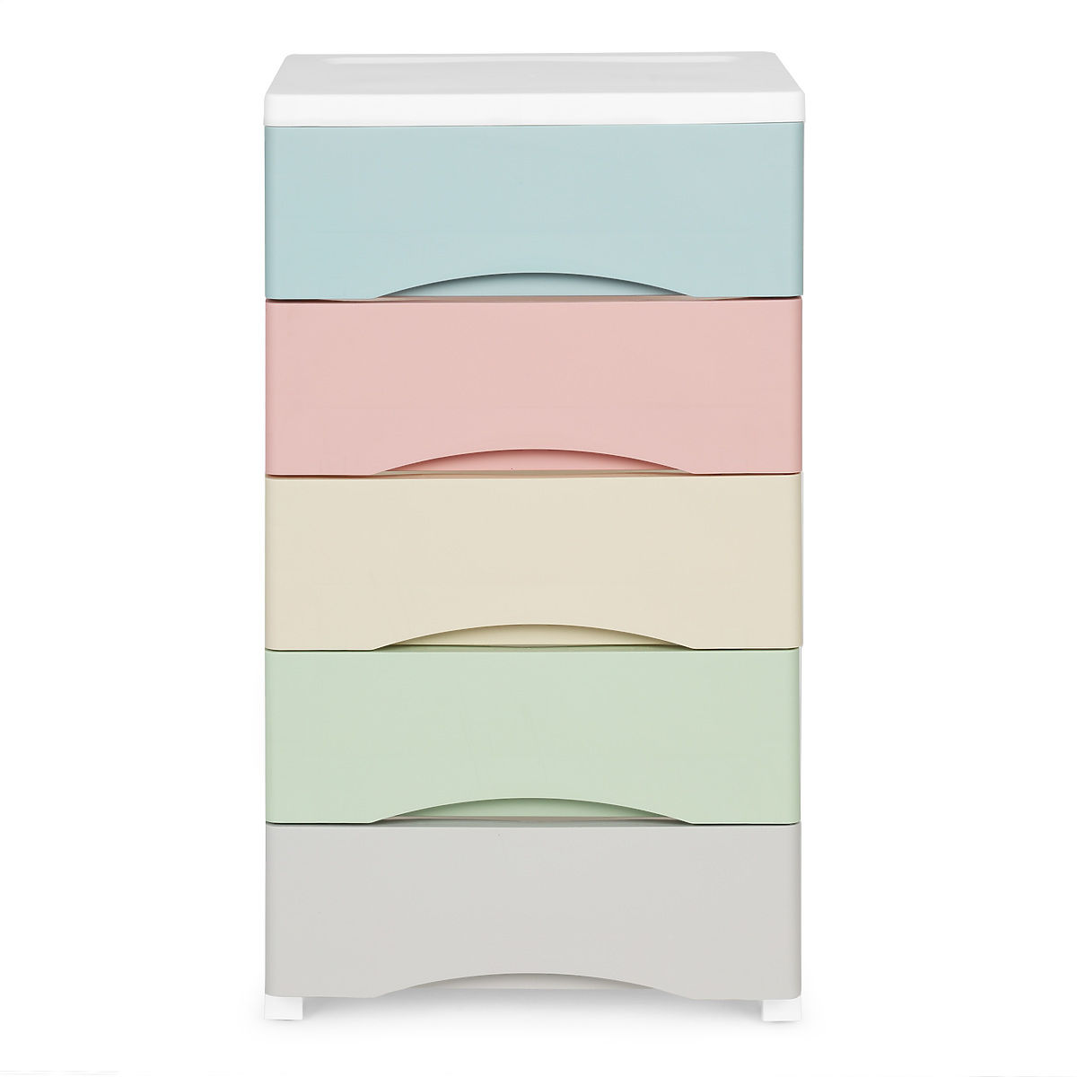 Der Regal besteht aus fünf bunten Schubladen mit speziell geformten Griffen an der Vorderseite, die das Ein- und Ausziehen erleichtern.
