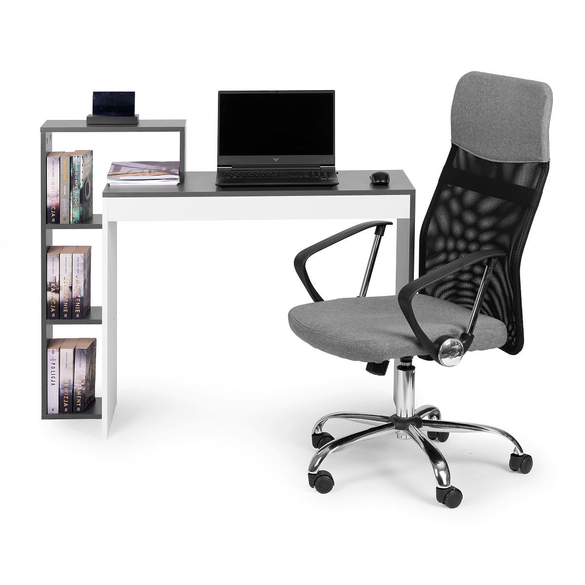 Luka-home.de » Tische und Couchtische / Schreibtische / Weiß-grauer Büroschreibtisch + Regal mit 4 Regalböden