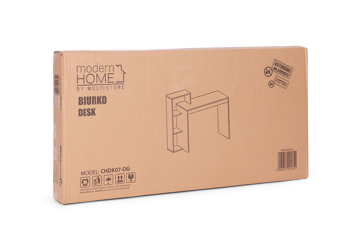 Moderner Schreibtisch und schlichtes Design, das ist das Angebot für Liebhaber eines ungewöhnlichen Stils und Funktionalität. Die Tischplatte und die Regale bestehen aus Spanplatte, die mit grauem Laminat überzogen ist. Dadurch glänzt das Möbelstück leicht und wirkt sehr luxuriös.