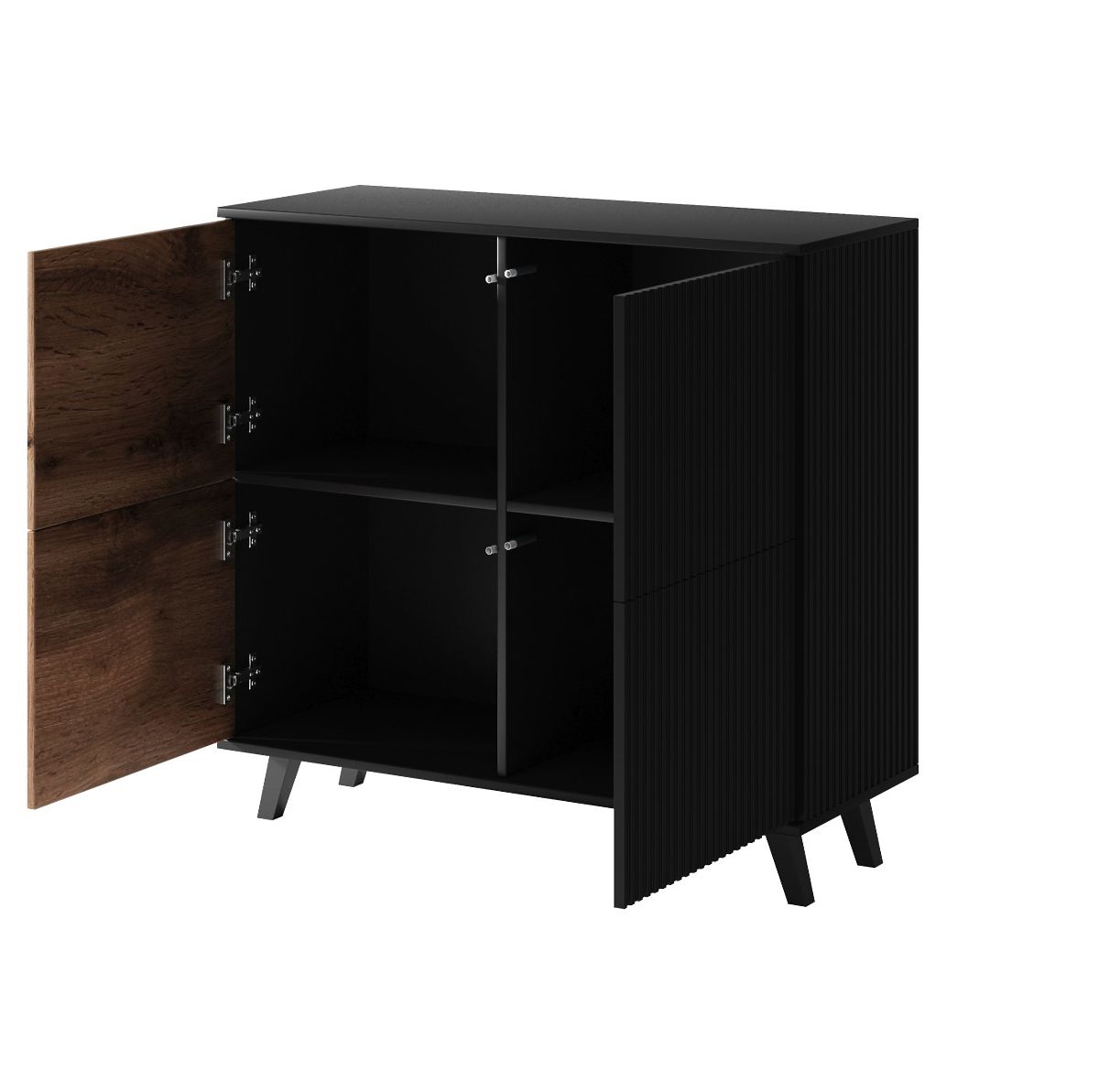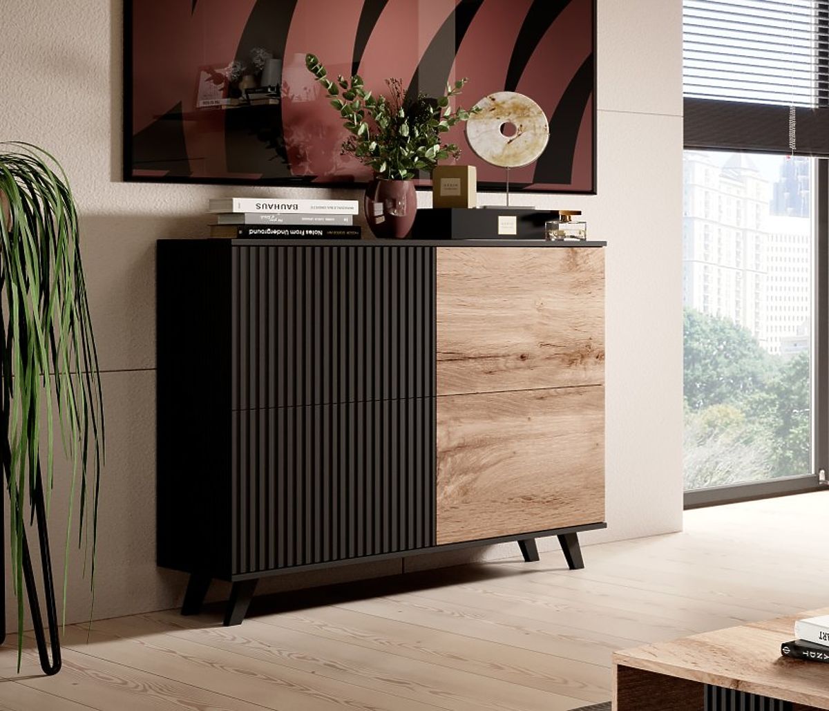 Verleihen Sie Ihrem Zuhause einen Hauch von moderner Eleganz mit der Kommode Wotan Eiche - Schwarz. Diese Kommode wurde entworfen, um ausreichend Stauraum zu bieten und gleichzeitig ein stilvolles Element in Ihrem Interieur zu sein.
