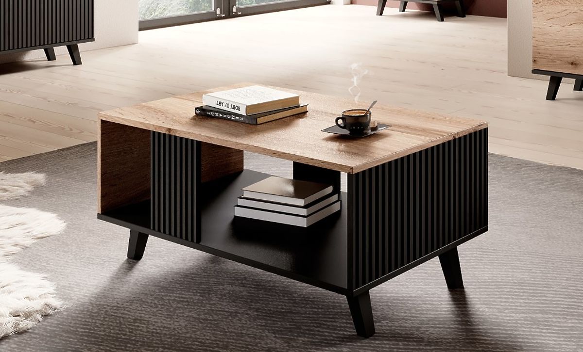 Moderner Couchtisch mit eleganter Kombination aus Wotan-Eiche und Schwarz. .. mehr