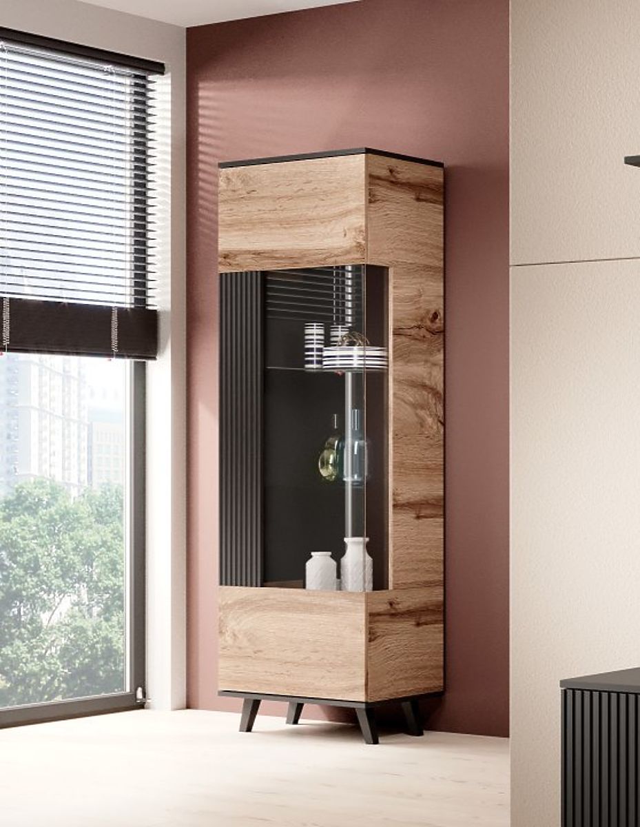 Farbe: Die Kombination aus Wotan Eiche und Schwarz verleiht der Vitrine ein modernes und anspruchsvolles Aussehen, das sich leicht in jeden Einrichtungsstil einfügt.