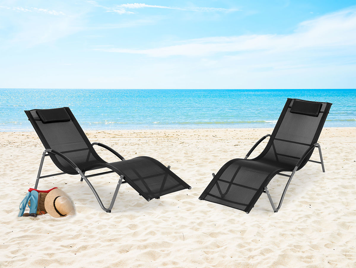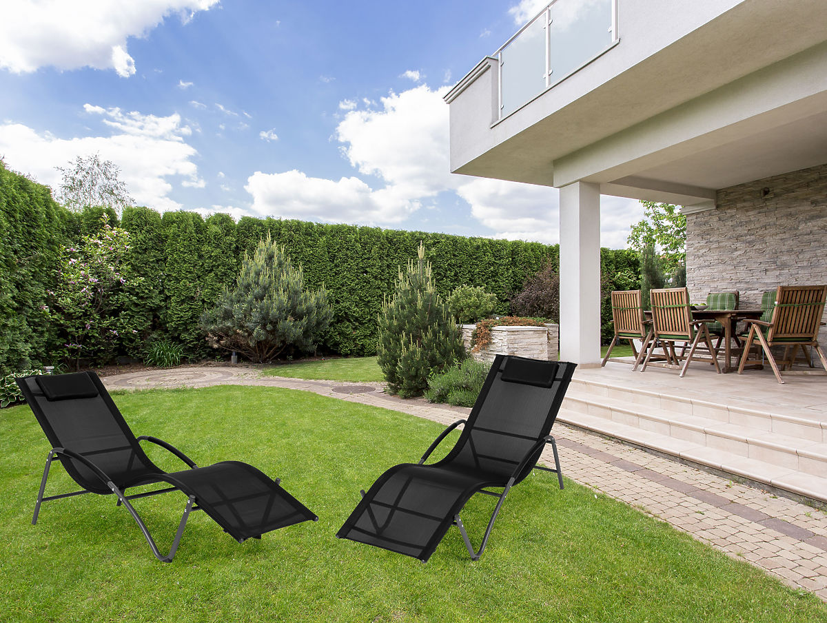 Schwarze Gartenliege mit Kopfstütze und Stahlkonstruktion. .. mehr