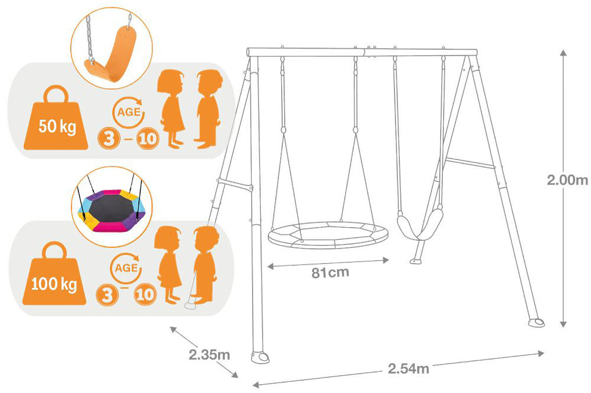 SICHERHEIT UND QUALITÄTDie robuste Konstruktion aus Metallrohren mit einem Durchmesser von 0,60 mm und einer Dicke von 0,09 mm sorgt für zuverlässige Stabilität und Langlebigkeit – auch bei täglichem, intensivem Gebrauch im Garten. Zusätzliche Befestigungsstifte sichern das Ganze effektiv gegen Verrutschen und garantieren maximale Sicherheit beim Spielen. Es ist eine Lösung, die den Eltern Ruhe und den Kindern noch mehr Freude bringt.