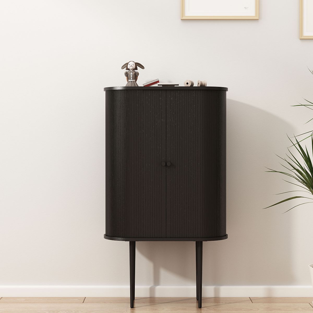 Elegante schwarze Kommode mit Eichenholzlamellen. .. mehr