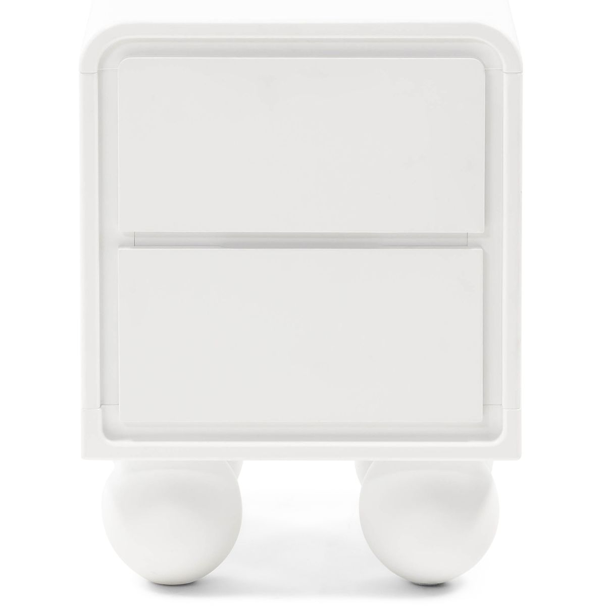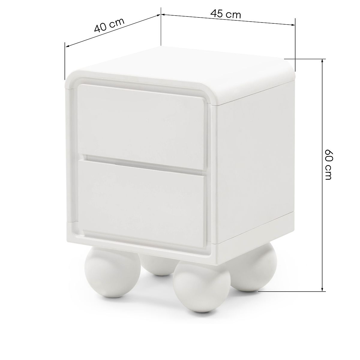 Weißer Nachttisch Lauria mit Kugelbeinen und zwei Schubladen. .. mehr
