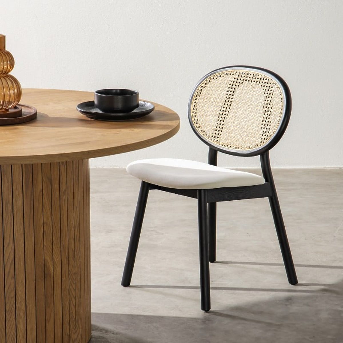 Luka-home.de » Esszimmer und Küche / Esszimmerstühle / Holzstuhl Monet mit Wiener Geflecht, Rattan, Samt, Schwarz/Ecru