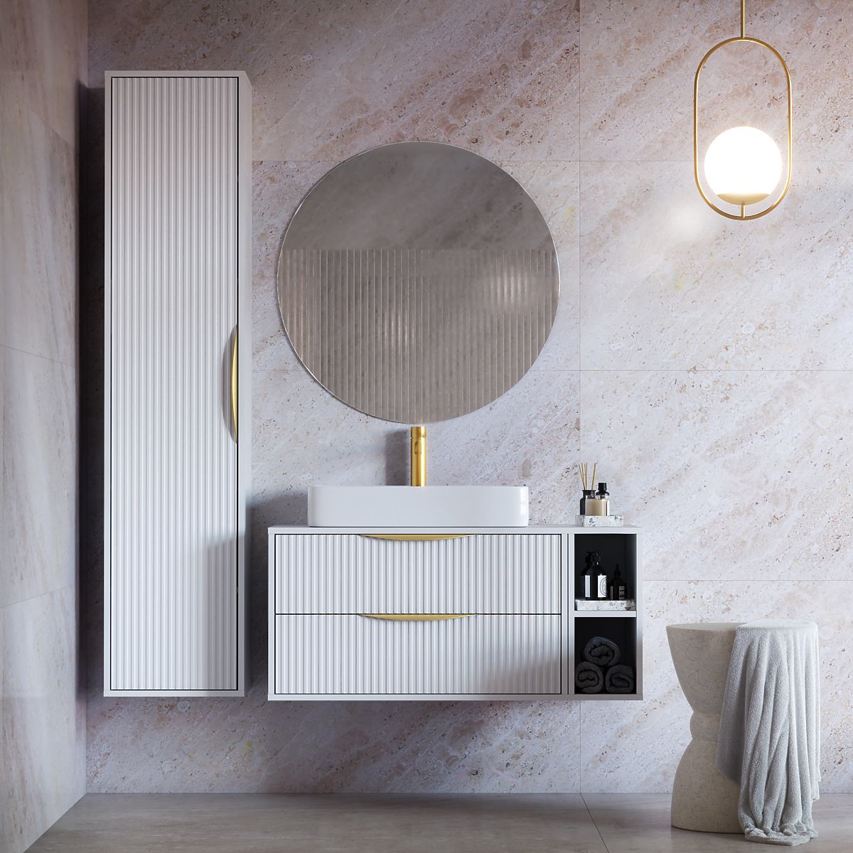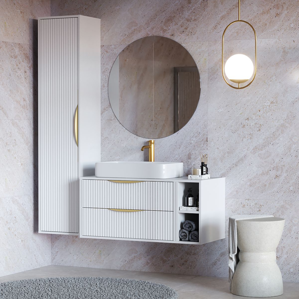Gerillter Waschtischunterschrank mit goldenen Griffen und Soft-Close-Schubladen. .. mehr