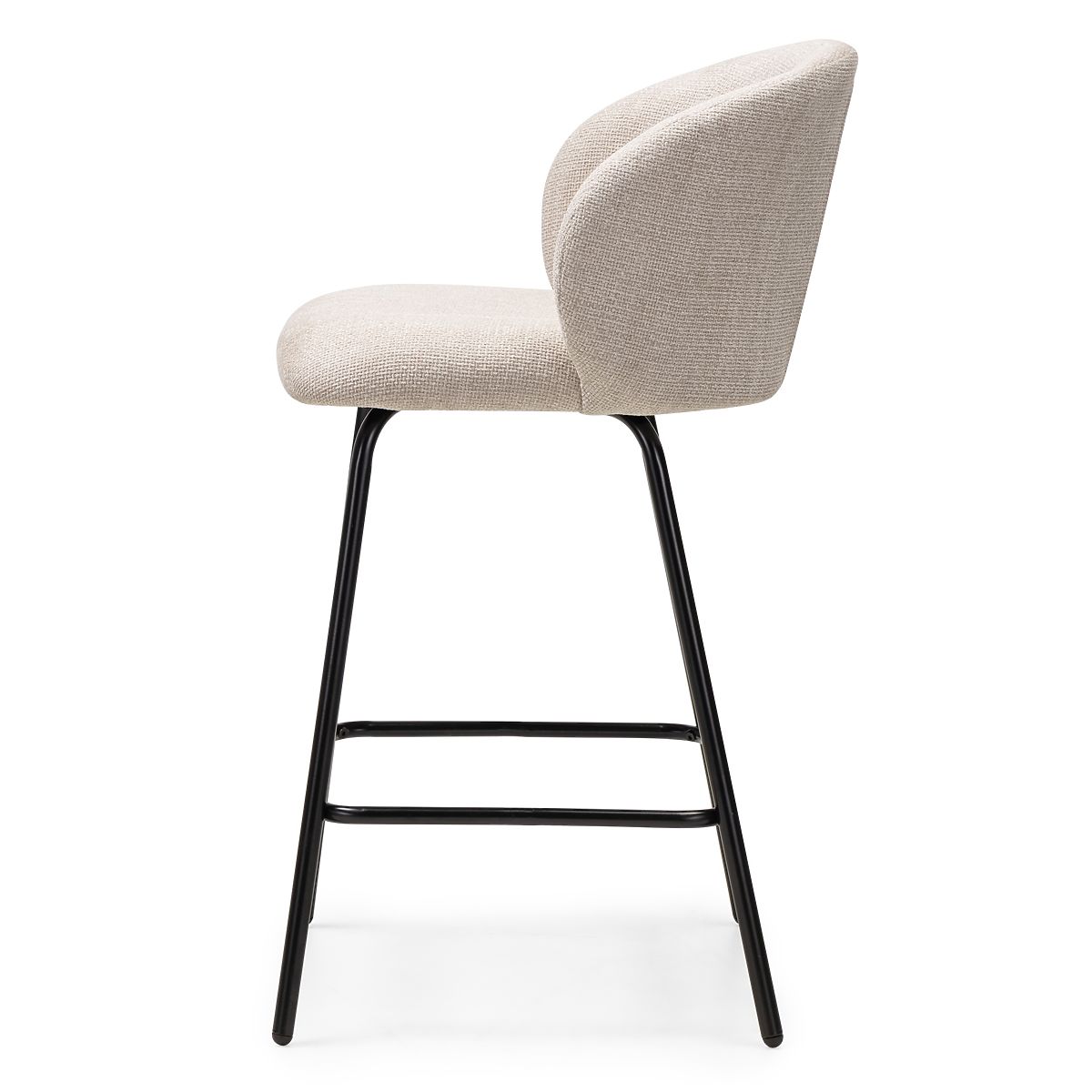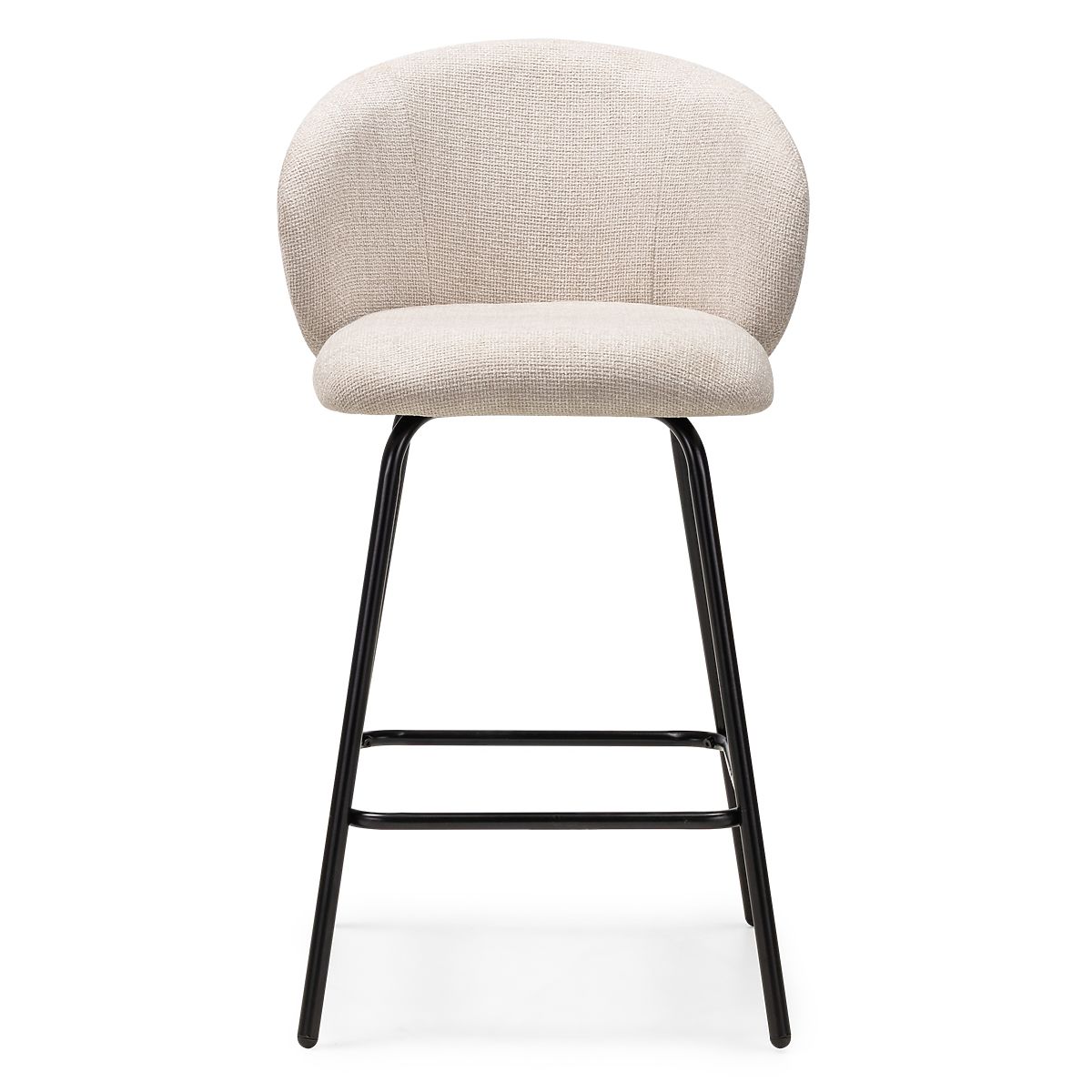 Barhocker mit beige Polsterung und schwarzen Metallbeinen. .. mehr