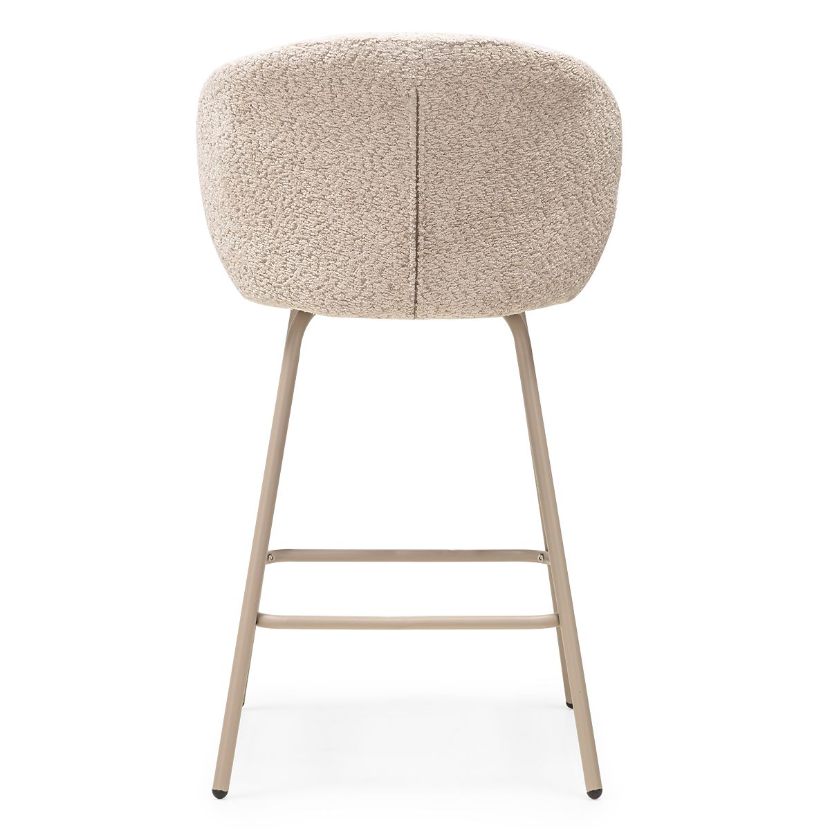 Barhocker mit weichem, beigem Stoffbezug und Metallbeinen. .. mehr