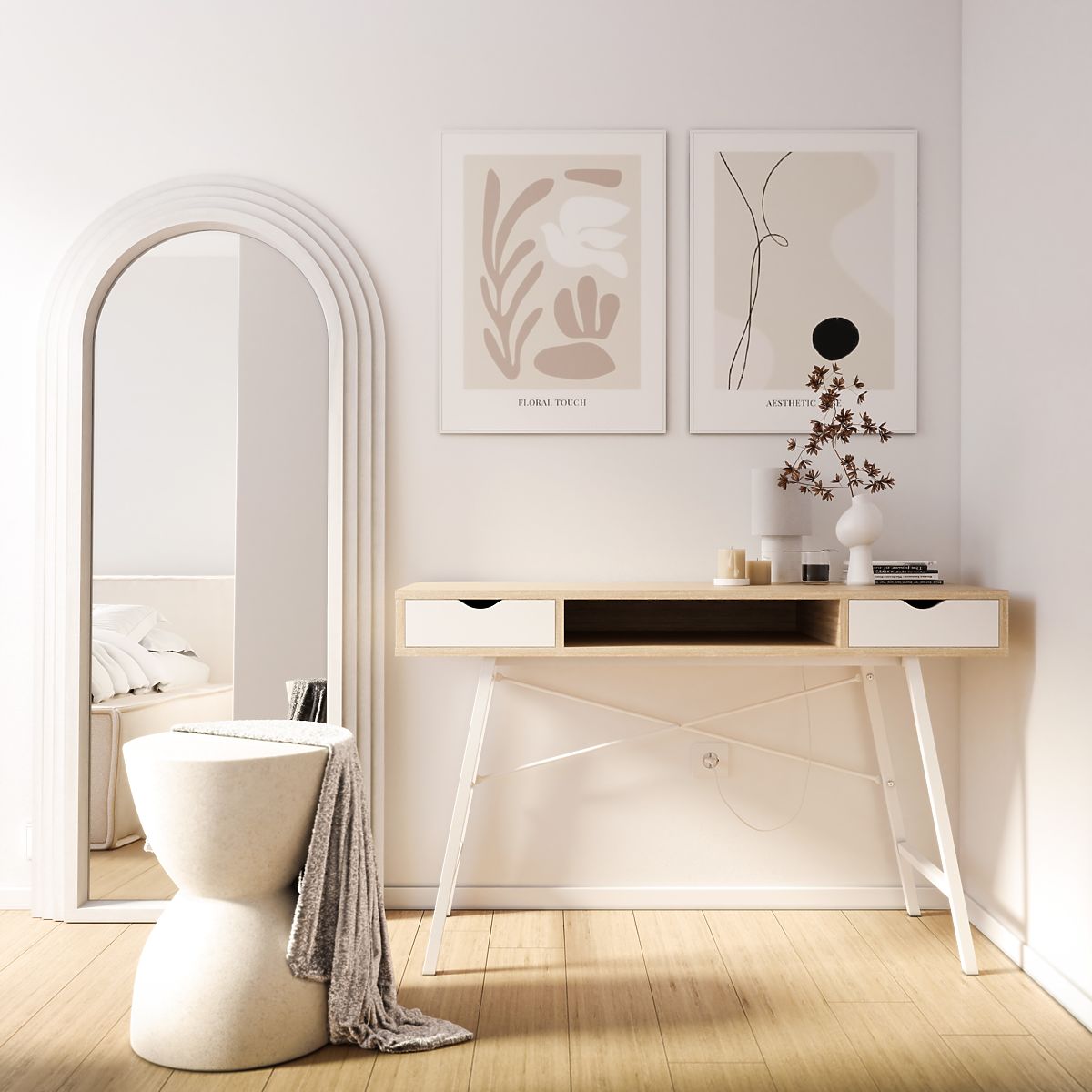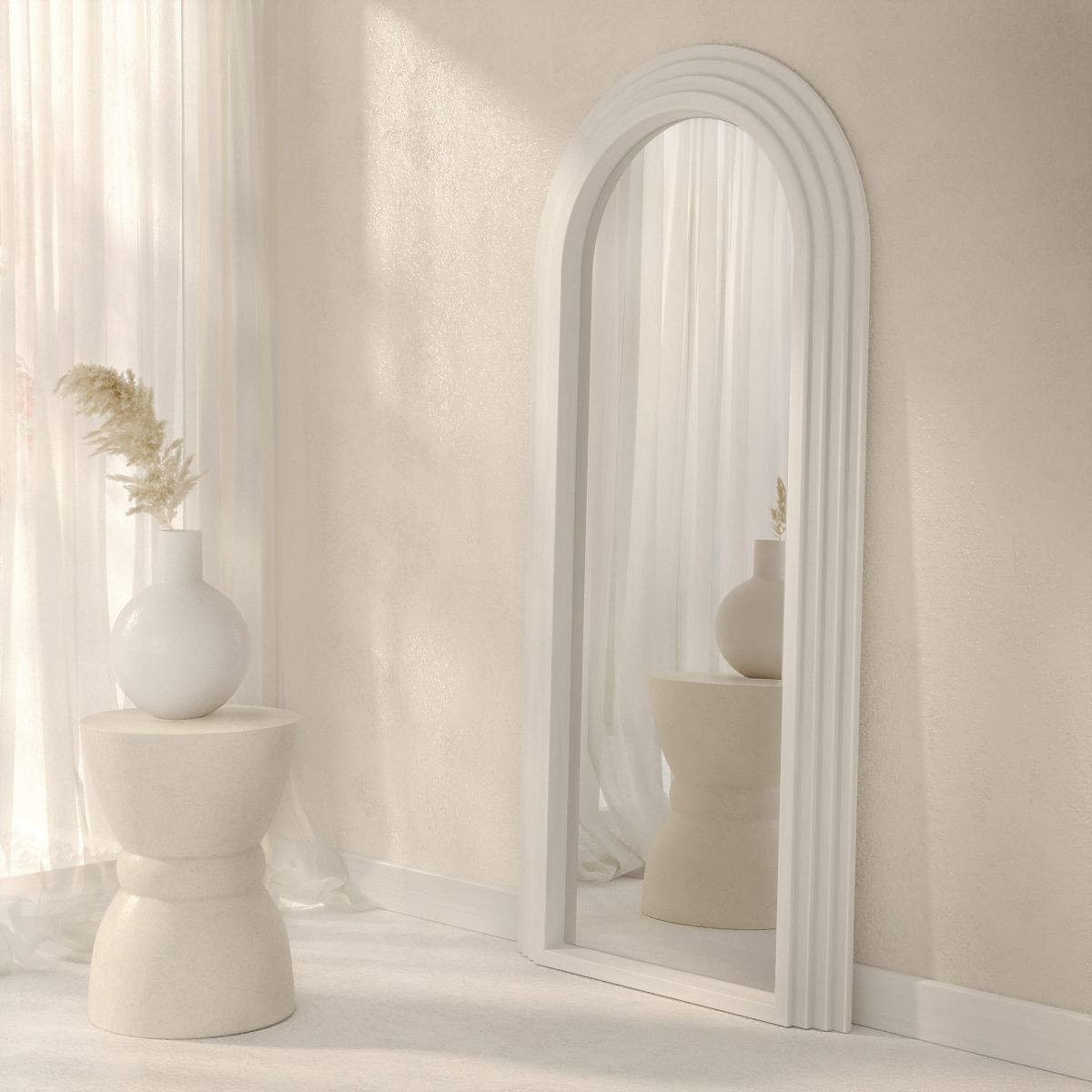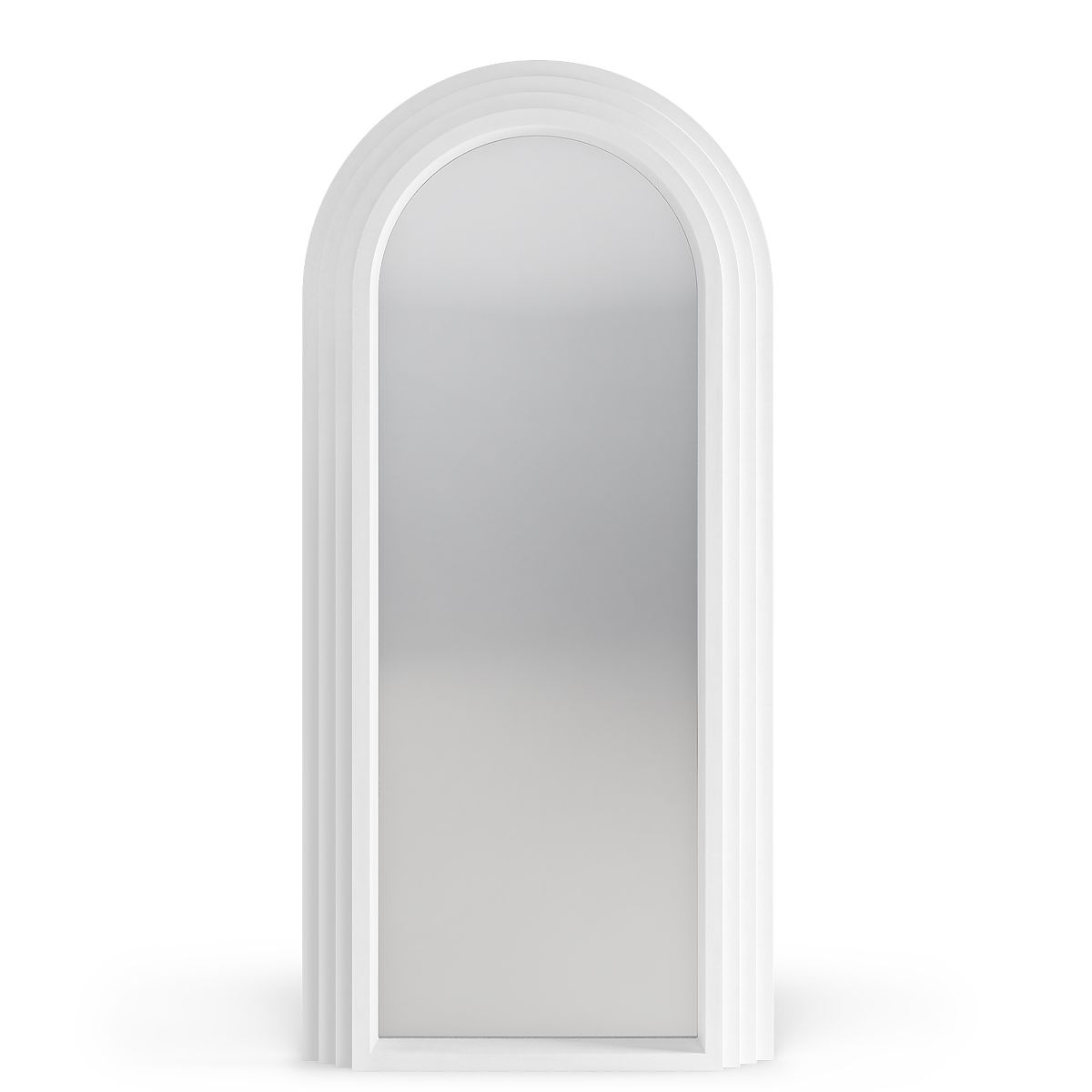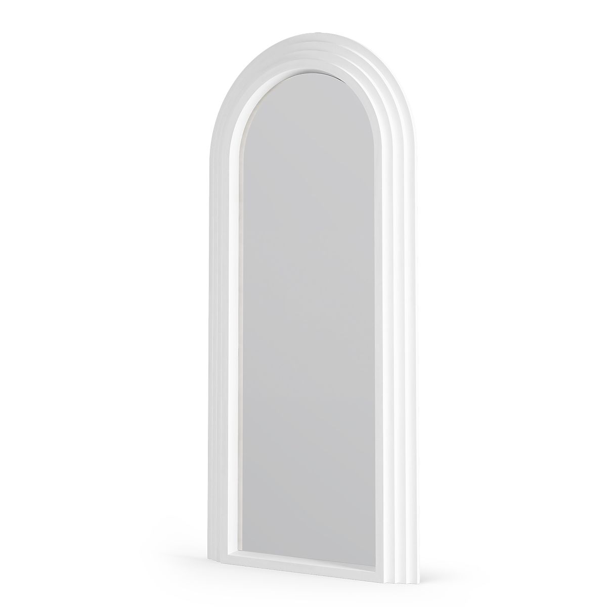 Dekoratives Hängespiegel mit weißem Bogenrahmen und klarem Spiegelbild. .. mehr