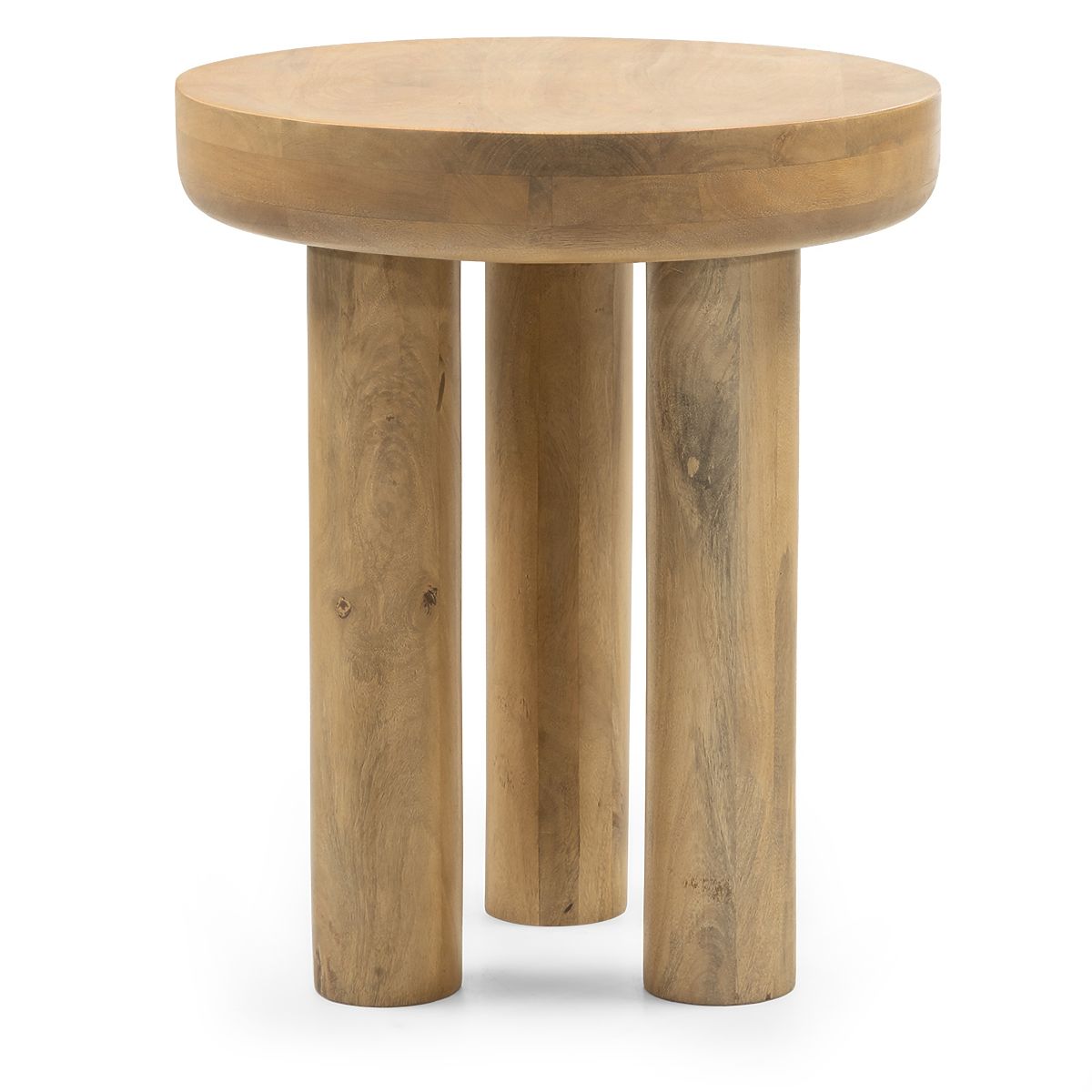Handgefertigter Beistelltisch aus Mangoholz mit runder Platte und eleganter Sand-Eiche-Farbe. .. mehr