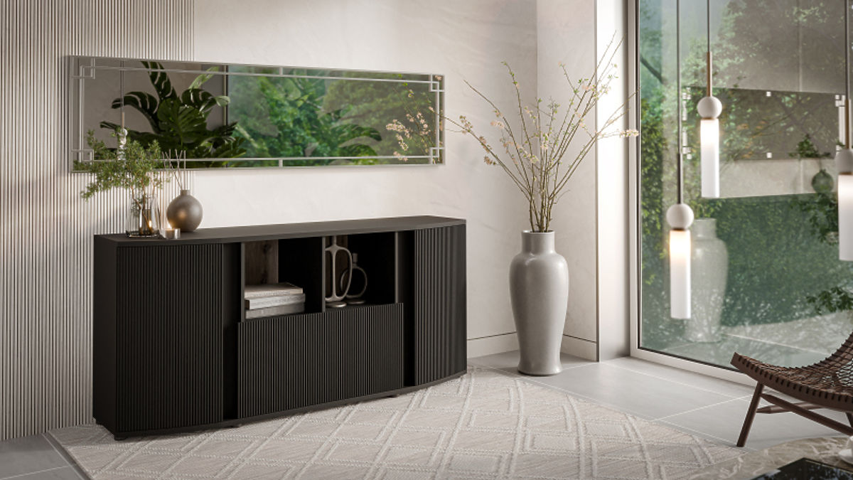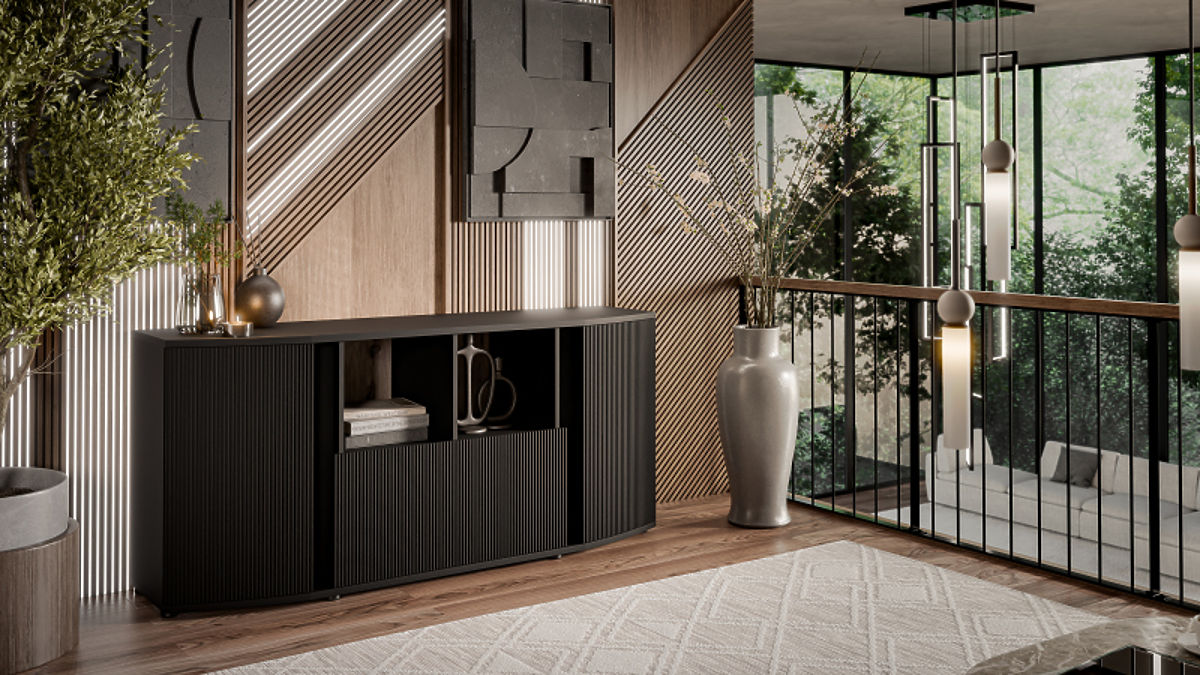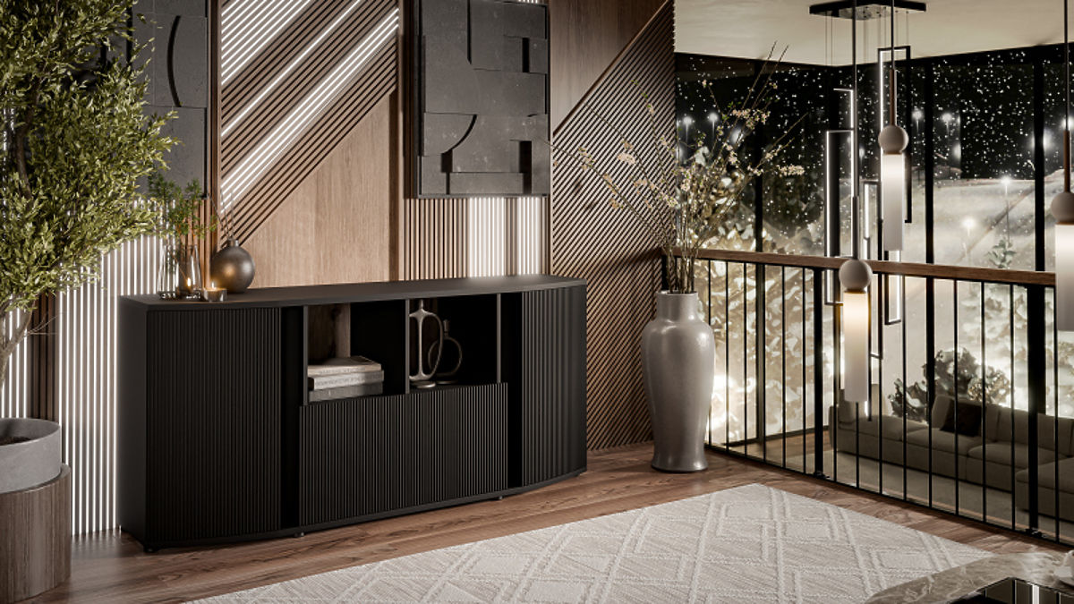 Schwarze Kommode aus MDF und Spanplatte mit Kunststofffüßen. .. mehr