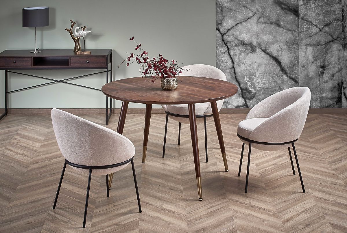 Runder Tisch mit Nussbaumplatte und goldenen Beinen. .. mehr