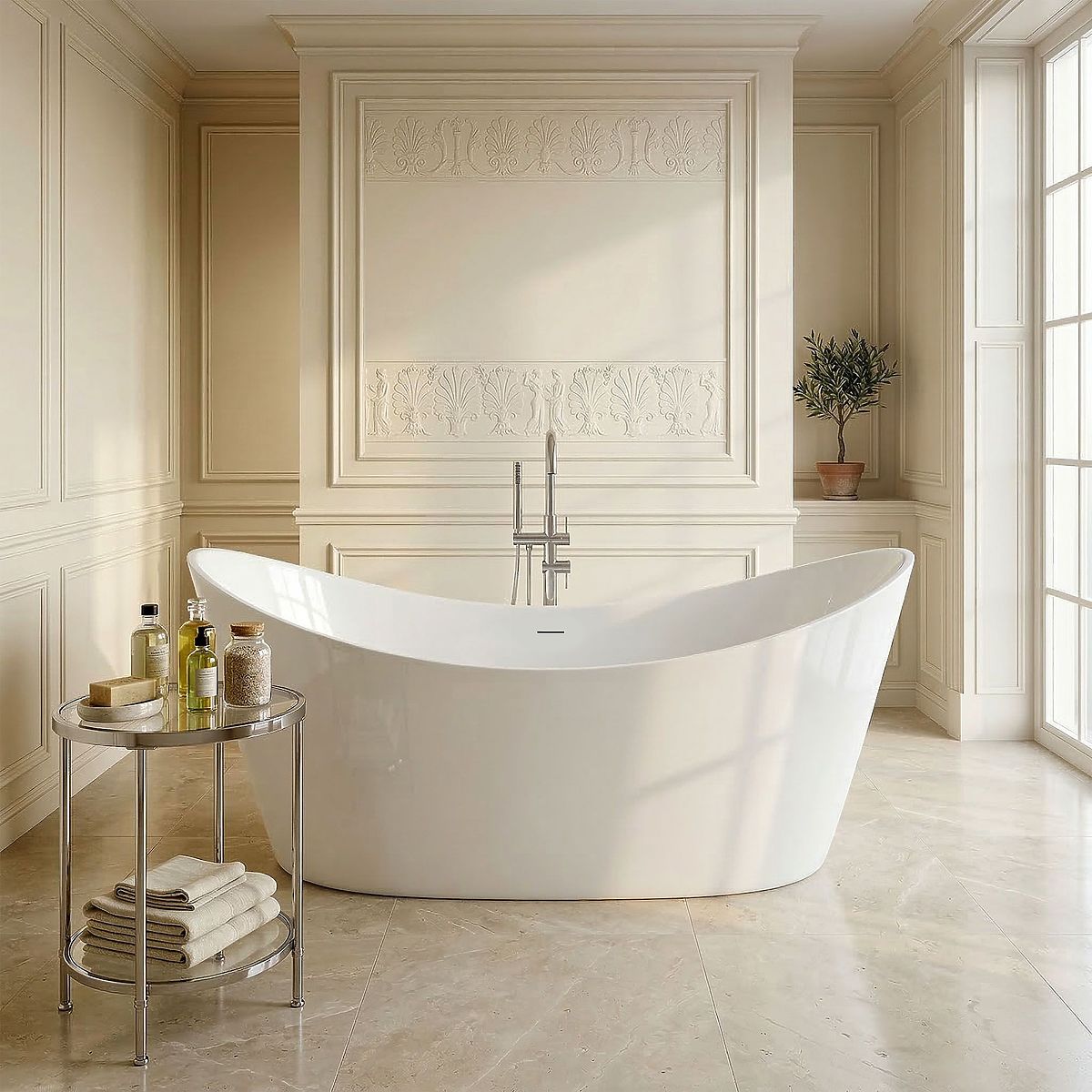Die schöne und äußerst funktionale Badewanne Ferrano füllt Ihren Badezimmerbereich perfekt aus und bewahrt dabei das makellose Erscheinungsbild und die Ästhetik des Interieurs. Die Badewanne ist für die Installation als freistehendes Element an jedem beliebigen Ort im Badezimmer konzipiert. Sie besteht aus strapazierfähigem Acryl, das resistent gegen Beschädigungen und Kratzer ist. Dank eines speziellen Herstellungsverfahrens ist sie langlebig und leicht sauber zu halten.