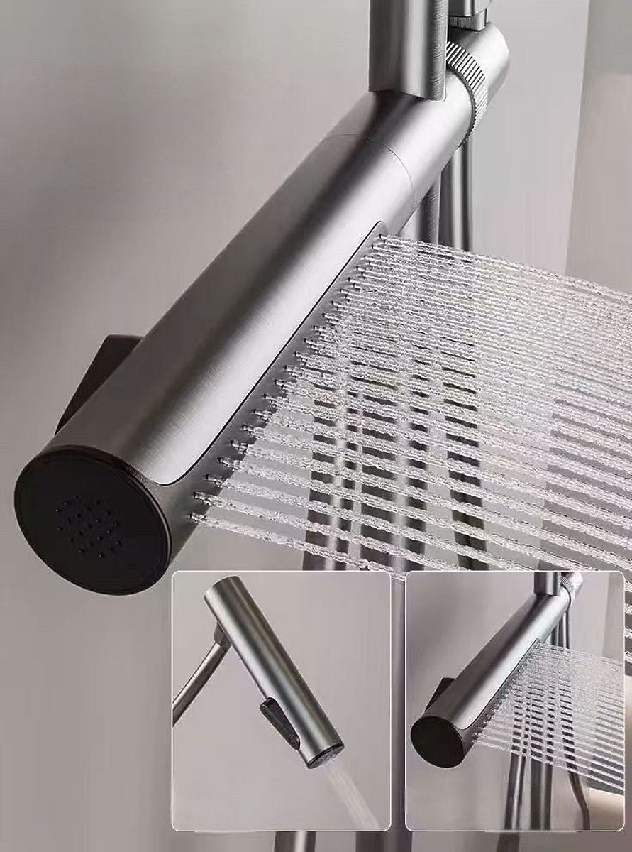 Besondere Aufmerksamkeit verdient die erweiterte Funktionalität: Im Halter des Sets ist eine ausziehbare, zweifunktionale Duschbrause mit Kaskaden- und Seitenwasserstrahl integriert, die als praktisches Bidet dienen kann. Außerdem enthält das Set eine klassische Duschbrause mit modernem Look – ausgestattet mit einem Wasserstrahlumschalter und einer Regendusche.