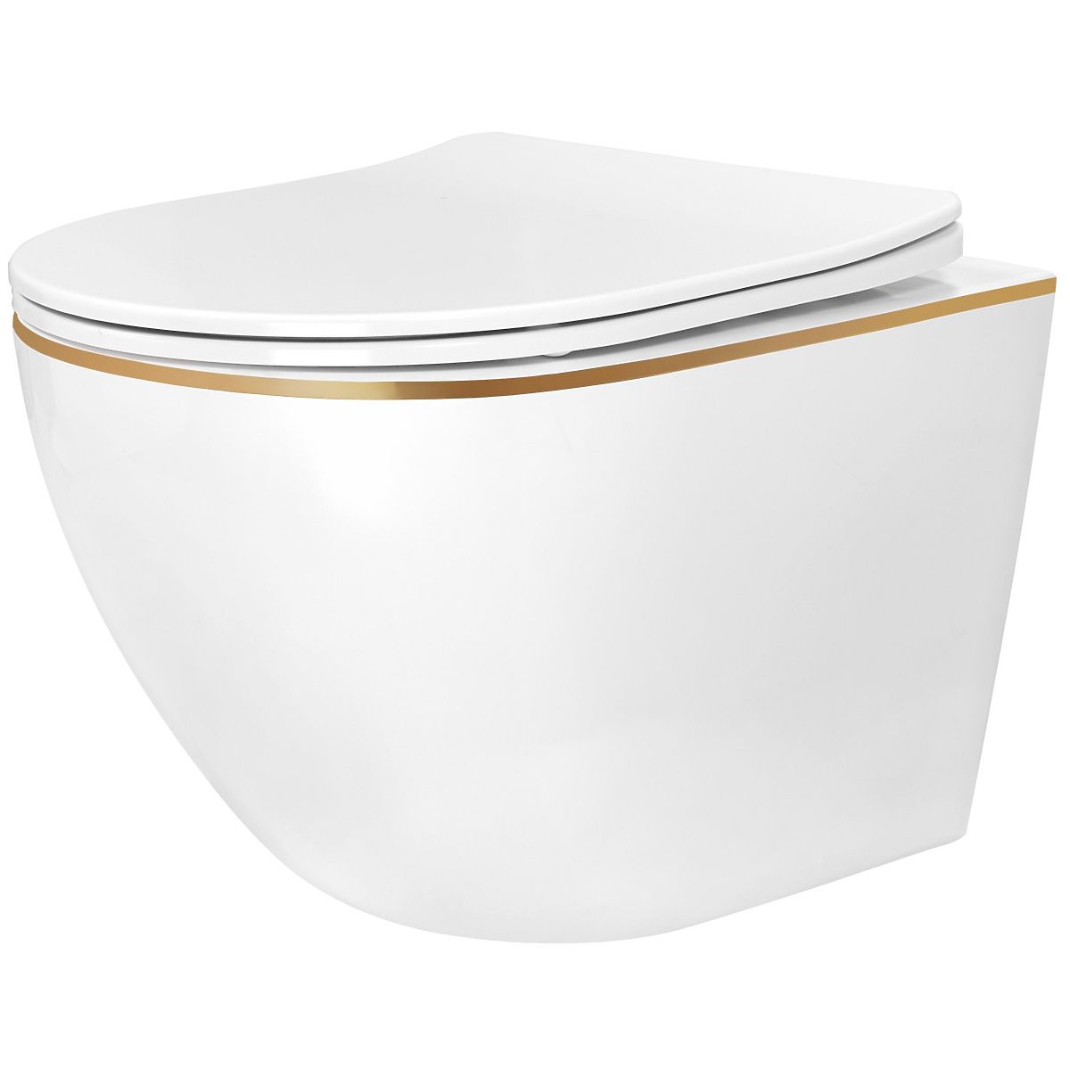 Die randlose Hänge-WC-Schüssel in Weiß mit goldener Kante und innovativem Spülsystem Tornado Nfq (Noise-Free Quiet) ist eine moderne Lösung, die Eleganz, einfache Reinigung und Spüleffizienz vereint. Die randlose Konstruktion verleiht nicht nur Modernität, sondern erleichtert auch die Reinigung rund um die Schüssel. Mit Blick auf Sparsamkeit und Ökologie entworfen, verbraucht die Schüssel eine minimale Menge Wasser, ohne auf hohe Spüleffizienz zu verzichten. Die Schüssel ist mit den meisten Unterputzsystemen von Geberit, Grohe, Sanit, Rea kompatibel.