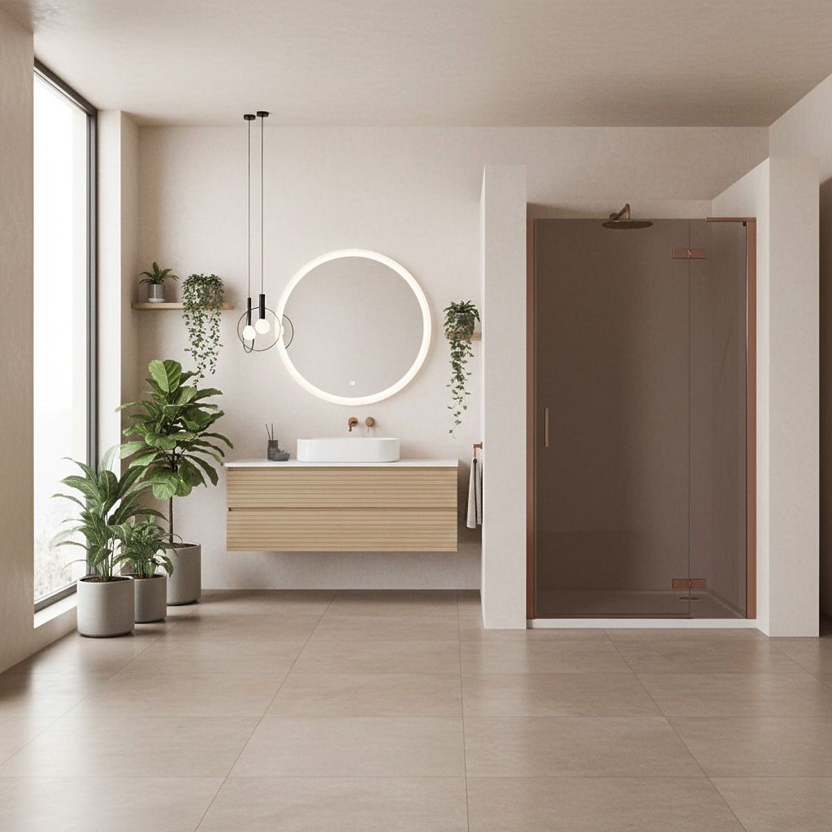 Die Duschtüren Hugo sind eine elegante Lösung, die modernes Design mit Funktionalität verbindet. Sie bestehen aus gehärtetem, rauchfarbenem Glas in einem Braunton und sind in Aluminiumprofilen in gebürstetem Kupfer eingefasst, was sie zu einem robusten und ästhetischen Element im Badezimmer macht. Ihre minimalistische Form sorgt dafür, dass sie sich hervorragend in verschiedene Einrichtungsstile einfügen. Die Glasoberfläche ist mit einer Easy Clean-Schicht überzogen, die die Bildung von Kalkablagerungen reduziert und die tägliche Pflege erleichtert. Diese Lösung vereint Ästhetik mit täglichem Nutzungskomfort.