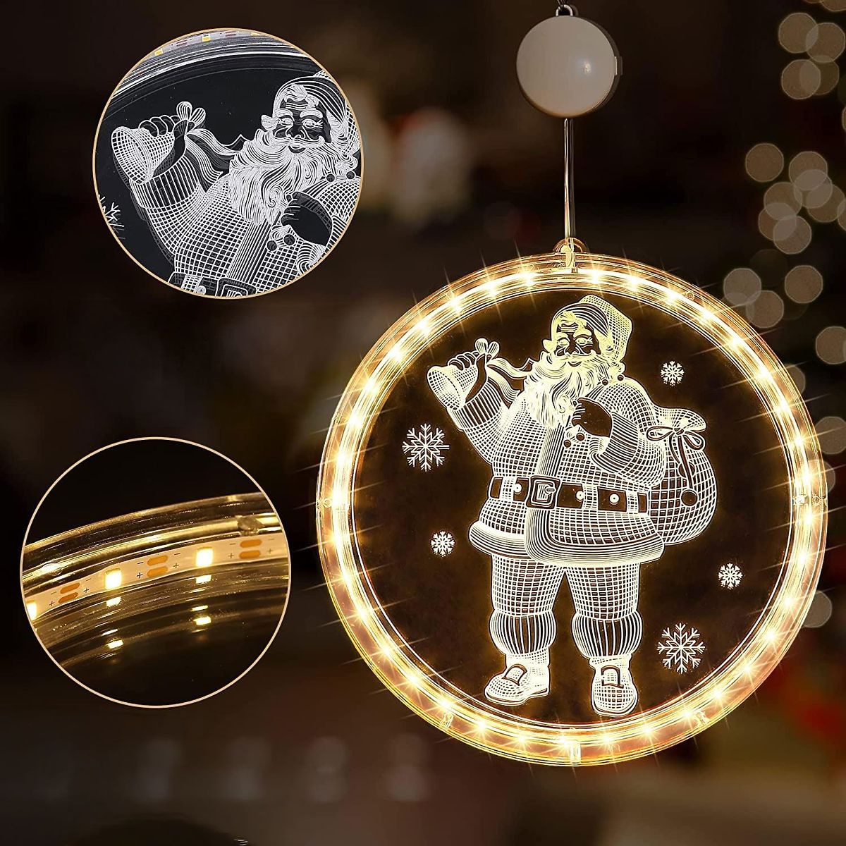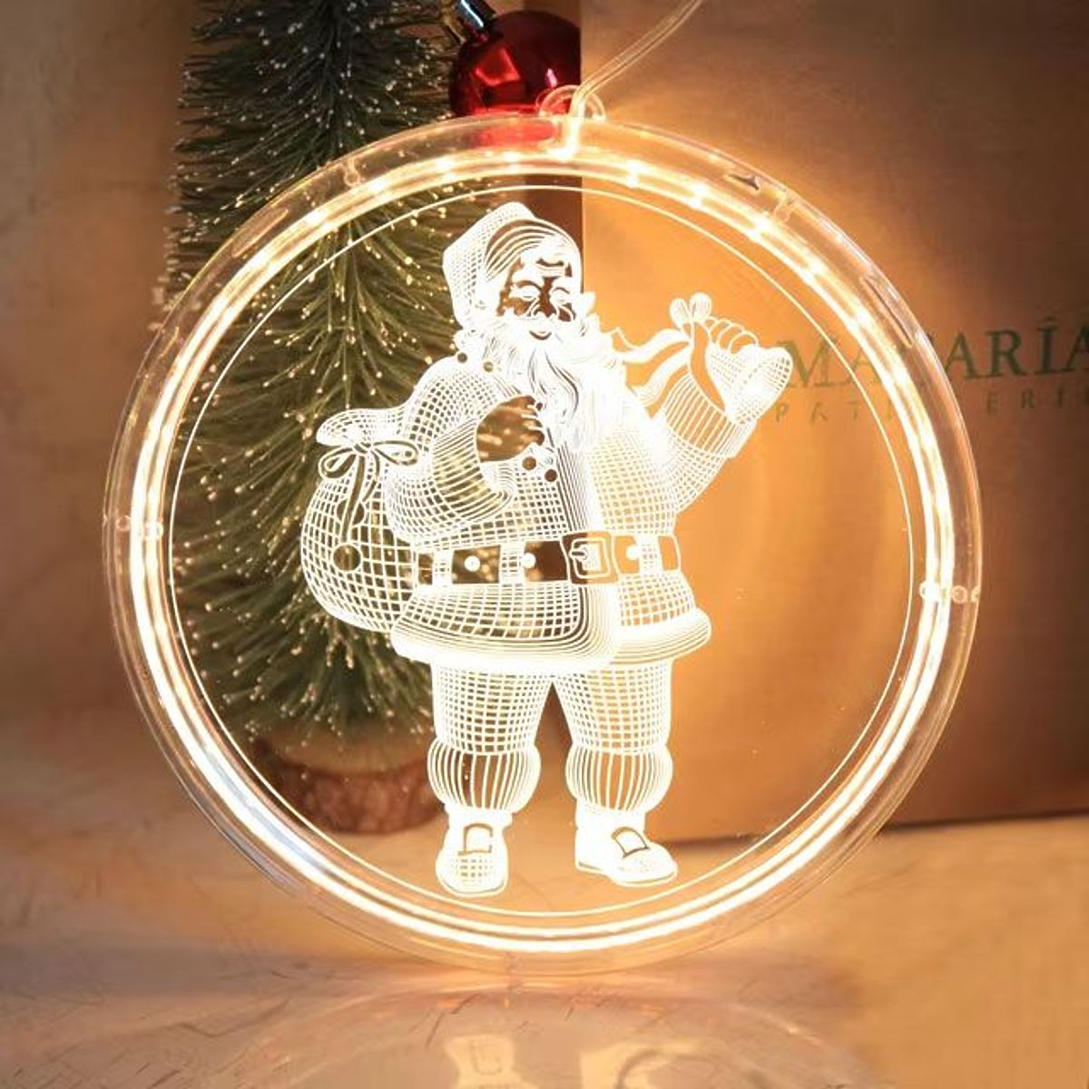 Weihnachten ist eine magische Zeit, und die Schaffung einer weihnachtlichen Atmosphäre ist unsere Pflicht :) Deshalb präsentieren wir heute eine absolute Neuheit dieses Weihnachtsfestes – eine transparente, hinterleuchtete LED-Lampe, die perfekt in jeden Raumstil passt, ihn erwärmt und all seine Vorzüge hervorhebt. Die dekorative LED-Lampe beleuchtet ideal Ihre Wände, Arrangements, Fenster und verleiht Ihrem Zuhause ein einzigartiges Aussehen.\n\nZahlreiche Lampen, die das Muster beleuchten, leuchten hell und die Lebensdauer der LED beträgt bis zu 11 Jahre ununterbrochenes Leuchten! LED-Lampen erhitzen sich nicht, was sie viel sicherer macht als Standardlampen.\n\nSpezifikationen:\n-Durchmesser 16 cm\n-Möglichkeit, an einem Haken der Batteriekasten oder leuchtenden Ring aufzuhängen\n-Anzahl der LEDs: 27\n-Stromversorgung: 3 x AAA-Batterien (nicht im Lieferumfang enthalten)\n-Lichtfarbe: Warm\n-Typ: energiesparende LED