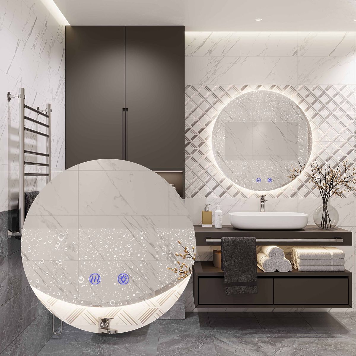 Der runde Spiegel mit LED-Hintergrundbeleuchtung ist die ideale Wahl für diejenigen, die Komfort bei der Nutzung und modernes Design schätzen. Der Spiegel ist aus hochwertigsten Materialien gefertigt, sieht großartig aus und ist sehr langlebig. Er bietet drei per Touch änderbare LED-Lichtfarben – warm, neutral und kalt – sowie eine Heizfunktion, die das Beschlagen der Oberfläche verhindert. Der Touch-Schalter, der sich auf der Spiegelfläche befindet, leuchtet bei Aktivierung der Funktion blau. Das Netzkabel ist weiß und hat eine Länge von 110 cm.