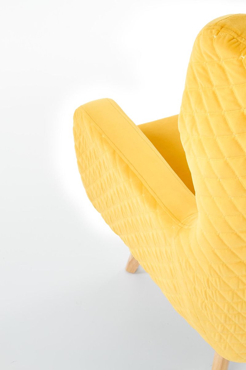 Relaxsessel mit gelber Polsterung und natürlichen Holzbeinen. .. mehr
