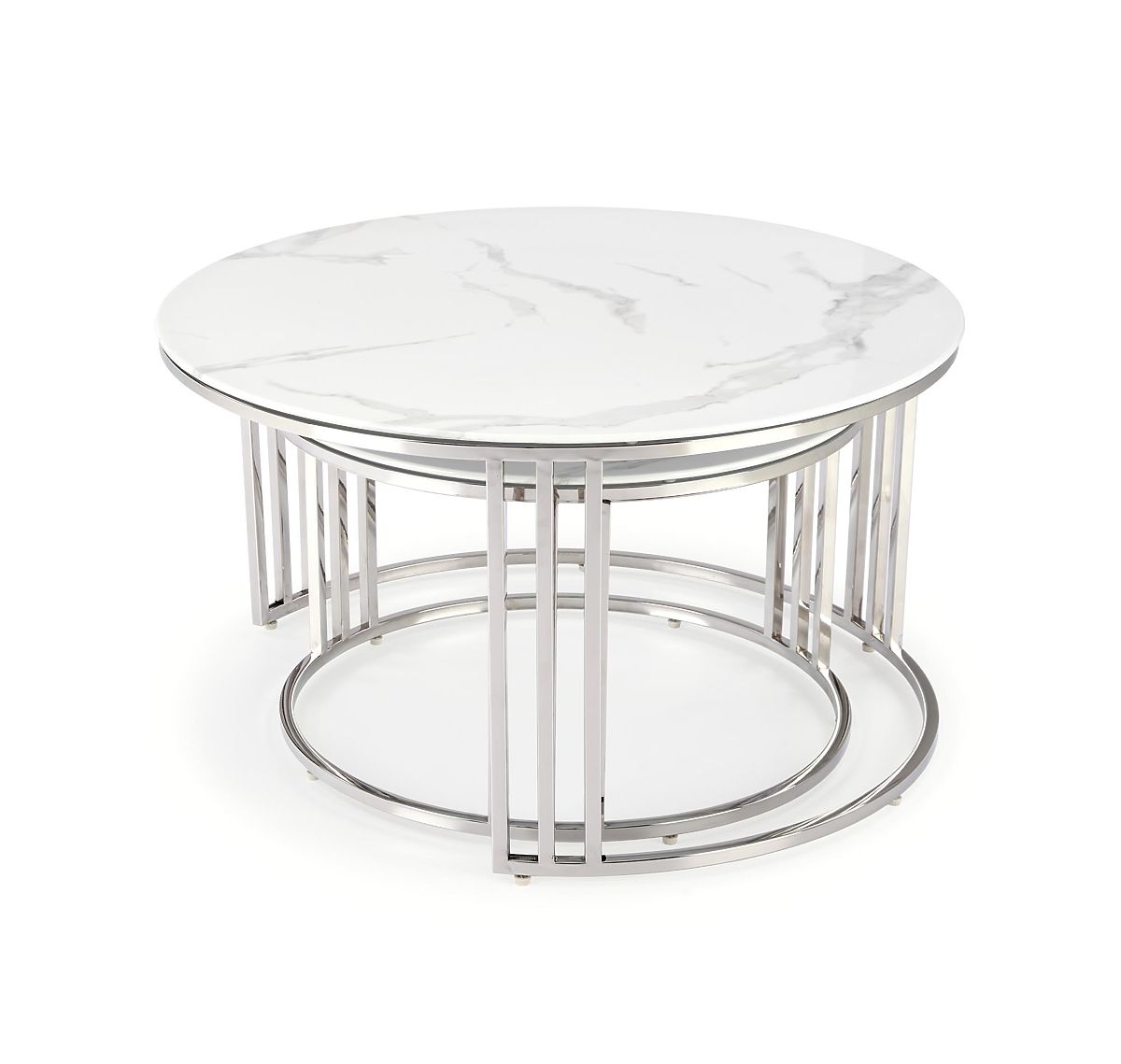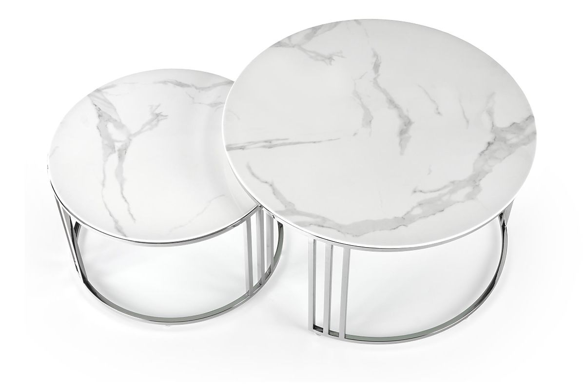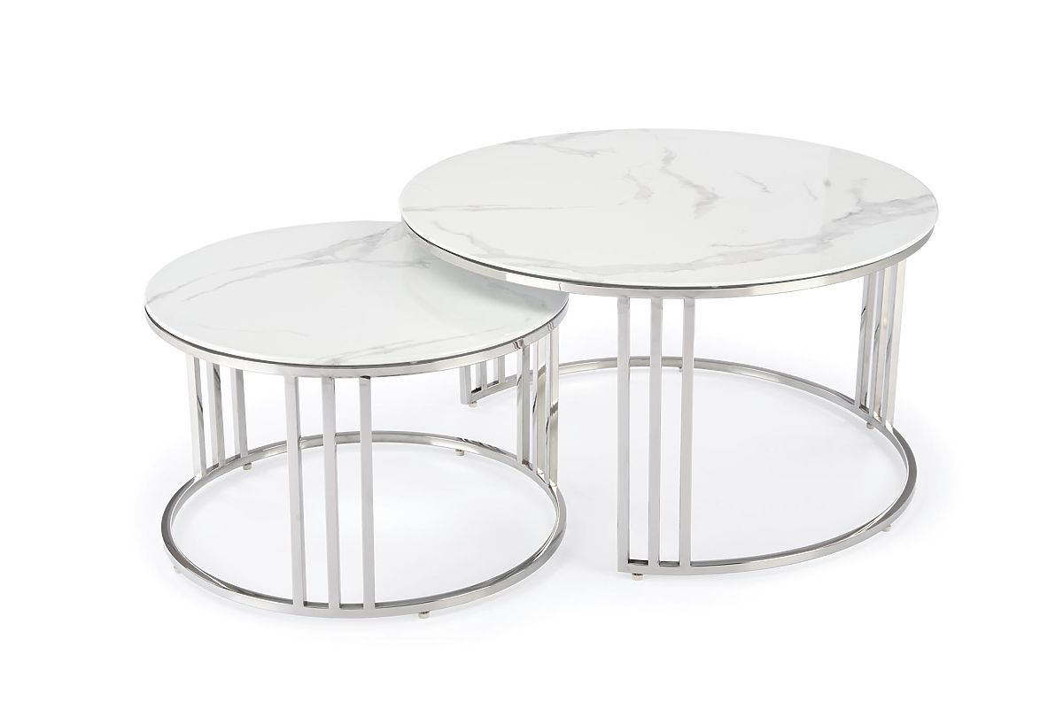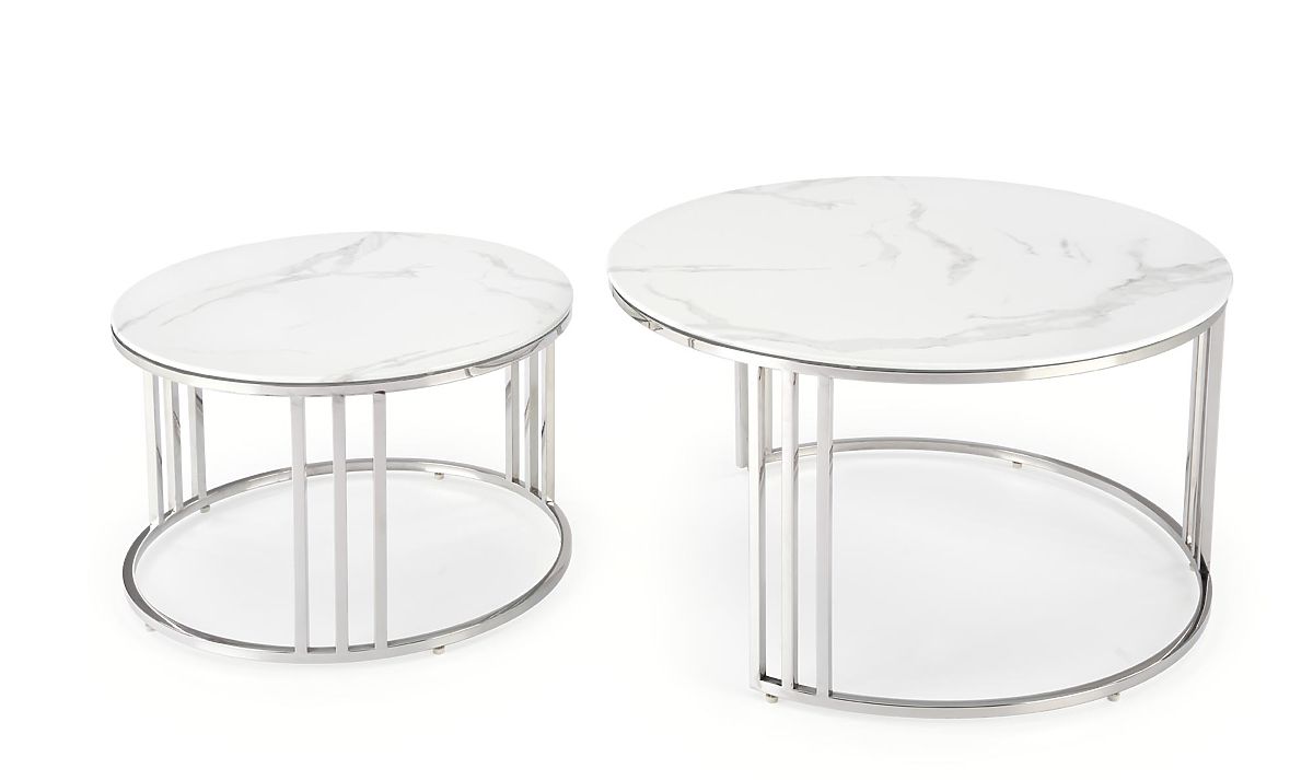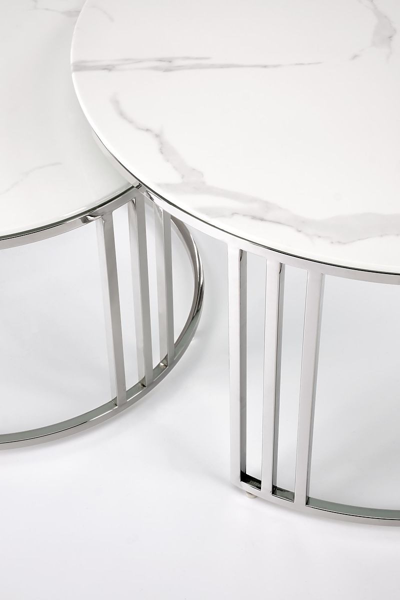 Luka-home.de » Tische und Couchtische / Couchtische / MERCURY 2 Set aus 2 Bänken, Rahmen - Silber, Glas - Weißer Marmor (1p=1Stk)