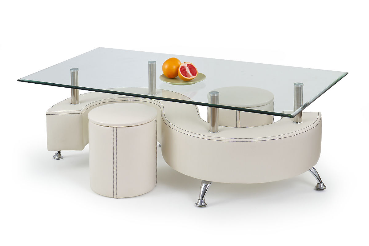 Wählen Sie für Ihr Wohnzimmer eine praktische und stilvolle Lösung in Form des Couchtisches Nina 3 H vom Hersteller Halmar. Die originell geformte Basis zusammen mit den angepassten Poufs schafft einen idealen Ort für entspannte Momente mit Familie und Freunden.