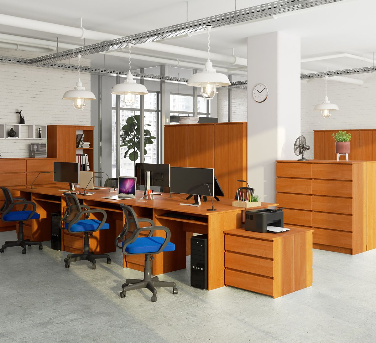 Freistehender Schreibtisch aus erlenfarbenem Laminat mit 135 cm Länge. .. mehr