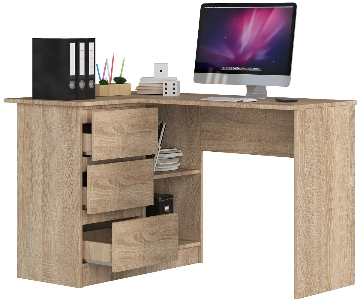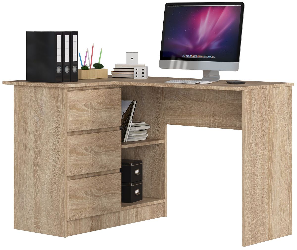 Sichtbare Kanten sind mit einer ABS-Kante versehen, um die Widerstandsfähigkeit gegen Beschädigungen zu erhöhen. Eckschreibtisch.